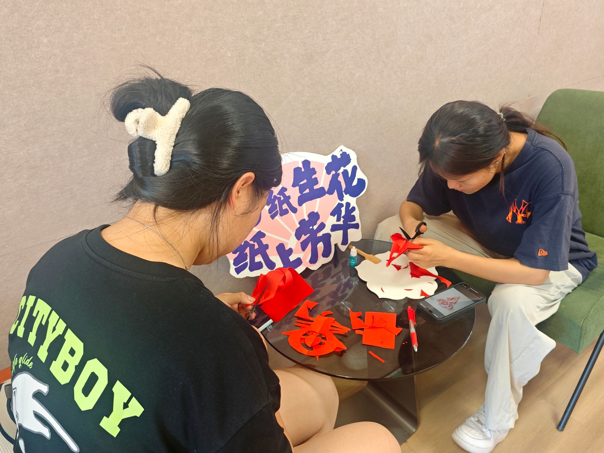 “谷雨三笺”剪纸活动设有花雨笺、字雨笺、人雨笺三类剪纸,同学们专注地剪裁,一张张红纸在剪刀开合间,化作栩栩如生的花朵、灵动飘逸的文字、形态各异的人物。大家相互切磋技巧,分享剪裁心得,共同感受传统剪纸艺术的精妙,现场气氛热烈而融洽。