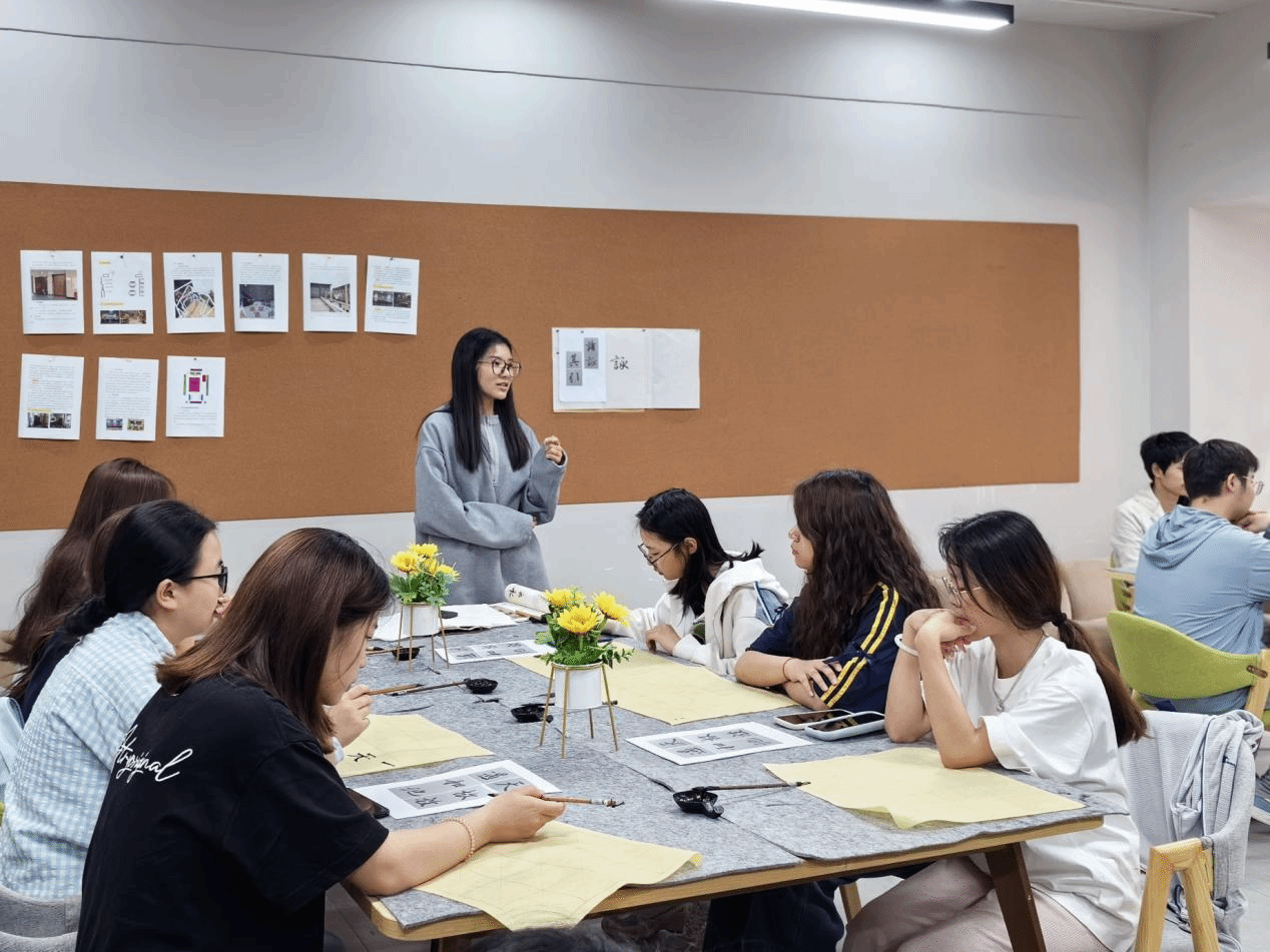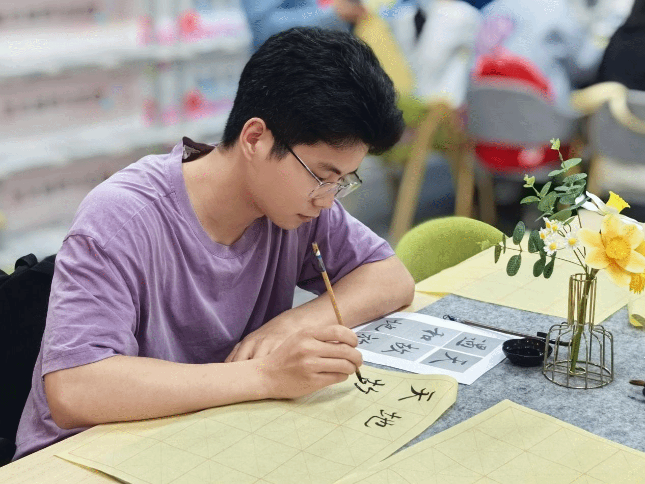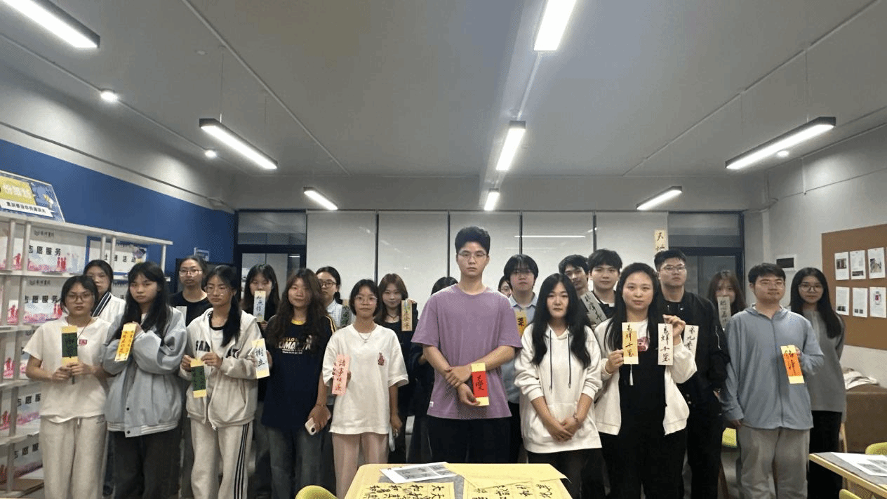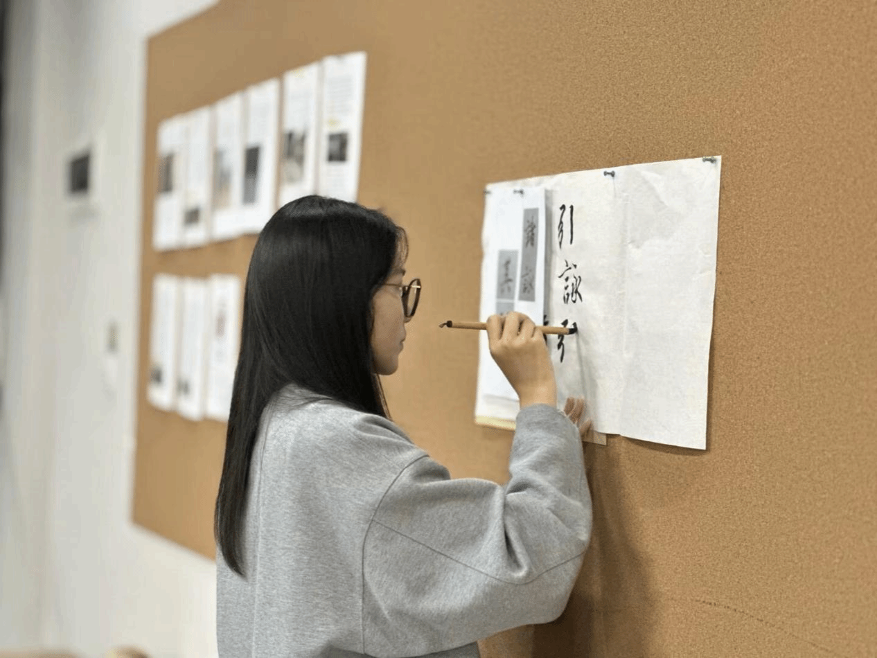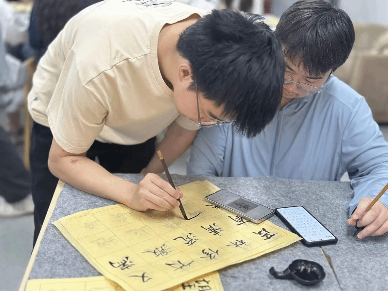 书法小课堂上,现场示范环节将气氛推向高潮,成为整堂课的夺目亮点。授课小老师一边示范,一边细致入微地讲解:“轻提时,如微风拂柳,轻盈而不失灵动;重按时,似苍松扎根,沉稳且极具力量”。轮到同学们亲自体验时,大家迫不及待地拿起毛笔,依照老师的教导认真临摹。尽管笔法生疏,但每个人都全神贯注,力求写好每一个笔画。助教穿梭其中,耐心地为同学们纠正握笔姿势、指导书写技巧,及时给予鼓励与建议。互动交流环节,同学们踊跃分享自己的书写心得,互相欣赏作品,在轻松愉快的氛围中共同进步。