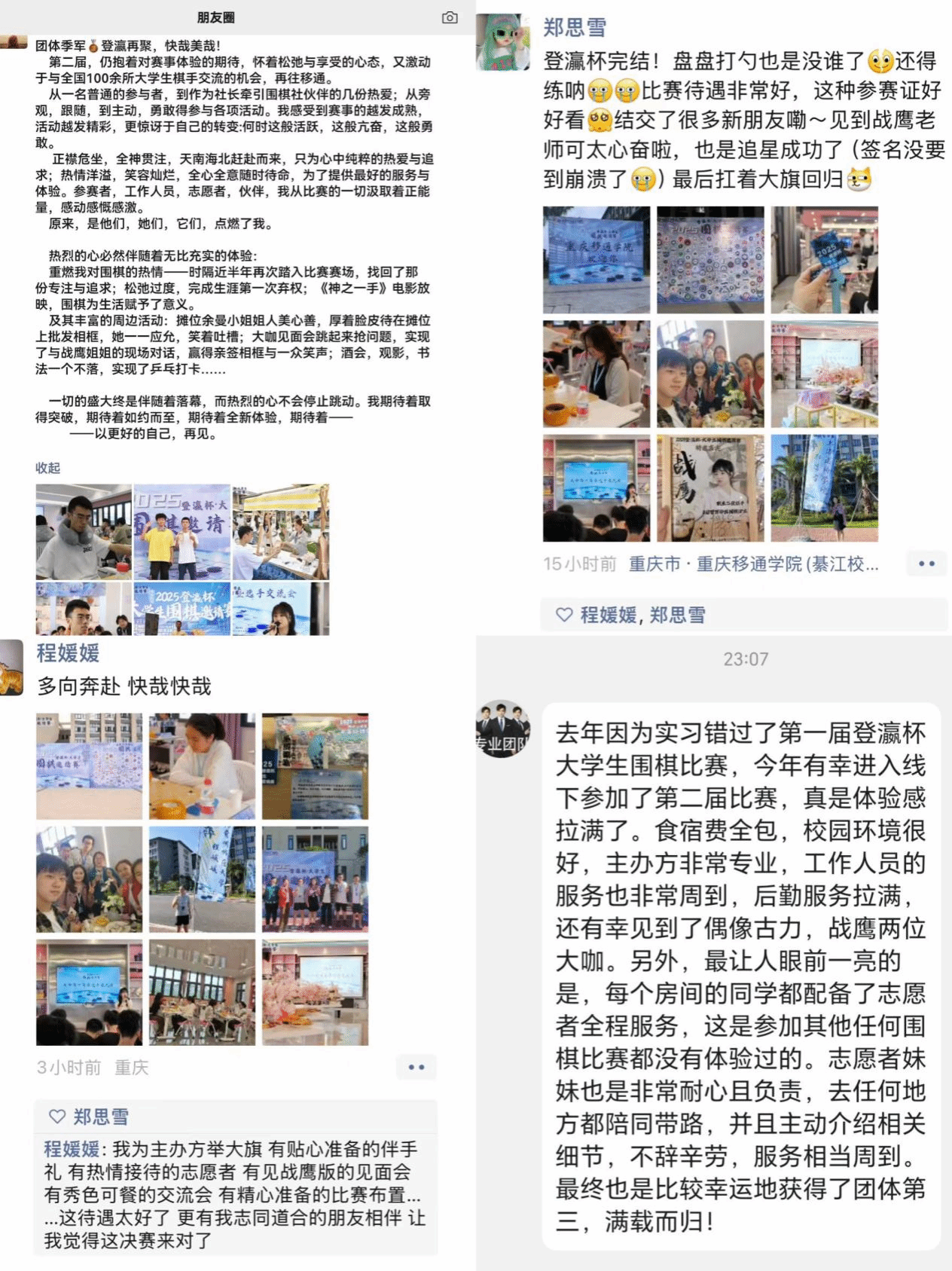 昨晚,2025登瀛杯·大学生围棋邀请赛交流群里面消息又开始99+,一条接着一条的是大家在社交平台分享的比赛体验和感悟,大家直呼这一场青春的、充满活力的赛事真的后劲太大了!