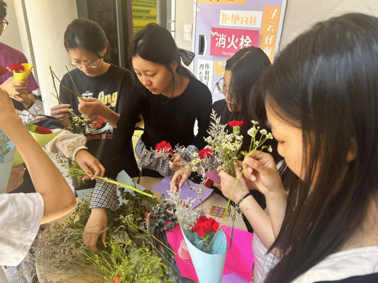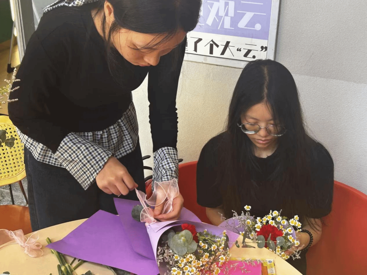 与此同时,花卉协会的同学们也开始了包花教学。为契合母亲节主题,他们准备了象征温馨与爱意的康乃馨、玫瑰等鲜花。花卉协会成员一边耐心讲解花材的特性与搭配技巧,一边示范如何修剪花枝、整理花束、包装装饰。参与者们认真学习,从最初的手忙脚乱,到逐渐熟练地挑选花朵、整理层次、系上丝带,一束束饱含爱意的花束在大家手中绽放。