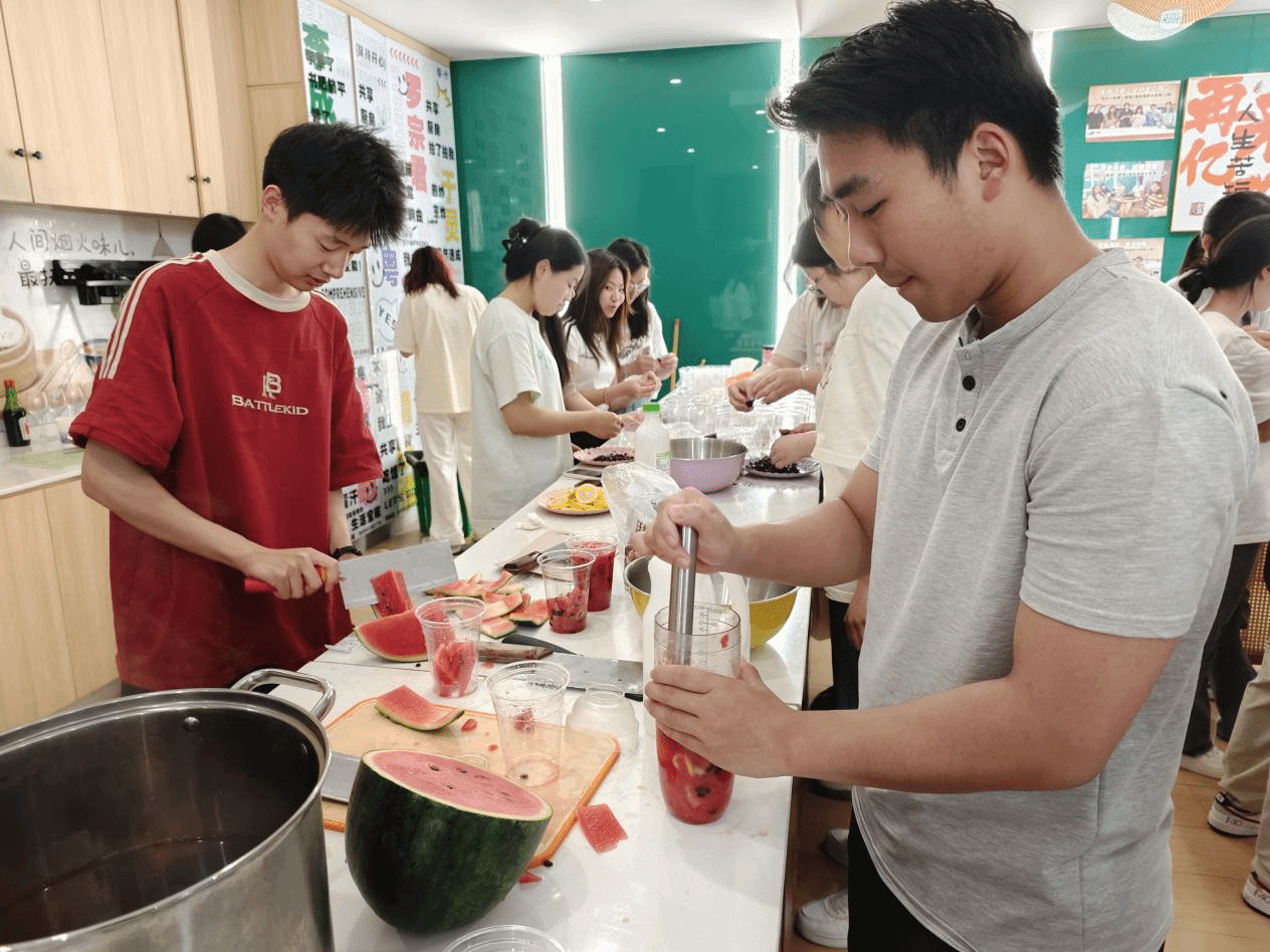 活动伊始,美食协会的成员们早已将制作芒果布丁、黑芝麻豆乳蛋糕、西瓜冰柠茶、青提椰椰的食材与工具整齐摆放。在组织者热情洋溢的开场后,美食协会的烘焙达人详细讲解并示范了各类甜品的制作步骤。参与者们纷纷动手,在专业指导下,小心翼翼地将芒果果肉切丁,倒入精心调配的布丁液,放入冰箱静待凝固;打发奶油、搅拌面糊,制作出松软香甜的黑芝麻豆乳蛋糕;将新鲜西瓜、柠檬、青提等水果巧妙搭配,制作出清爽可口的夏日饮品。现场香气四溢,欢声笑语不断,大家沉浸在美食制作的乐趣中。
