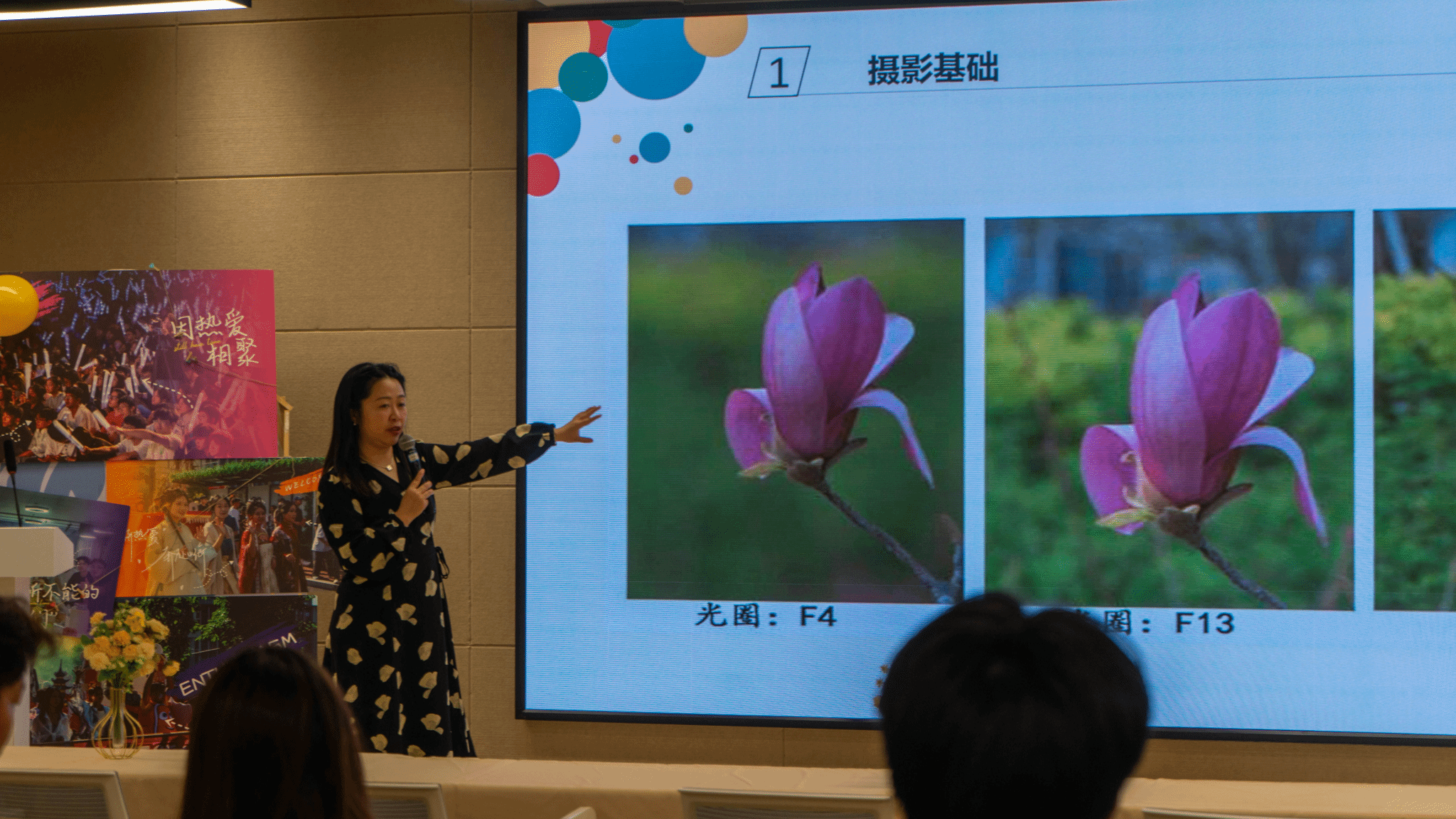 在课程中,周极老师通过生动的案例和现场不同的实践对比,向各学生社团负责人展示了不同拍摄手法呈现的不同效果。从最基本的快门、焦距、ISO,到不同的构图方式,再到不同的光线下从哪个角度拍更为合适,周极老师事无巨细的讲解让学生社团负责人醍醐灌顶。