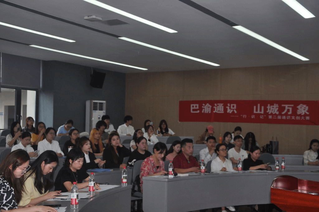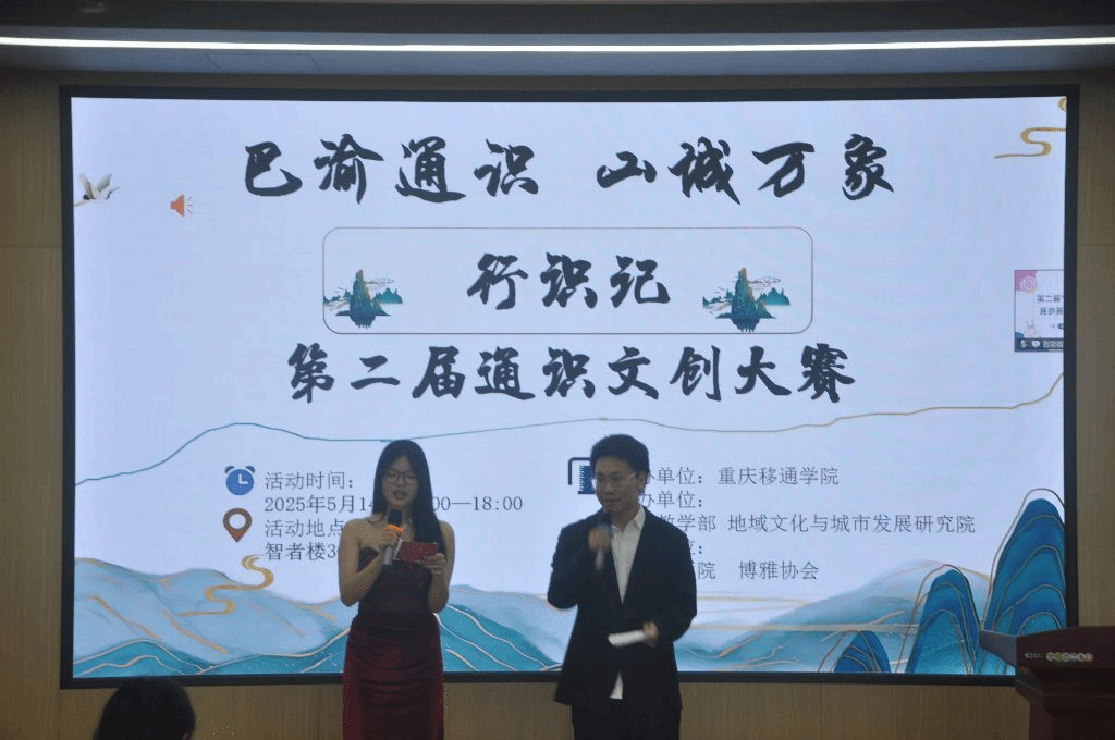 2025年5月14日,由重庆移通学院通识教学部、地域文化与城市发展研究院联合主办,綦江版画院、校博雅协会协办的“巴渝通识 山城万象——‘行·识·记’第二届通识文创大赛”决赛在綦江校区智者楼304报告厅举行。通识教学部主任皮若兰、綦江农民版画院院长刘月作为特邀嘉宾出席活动,吸引双校区师生代表100余人到场观摩。