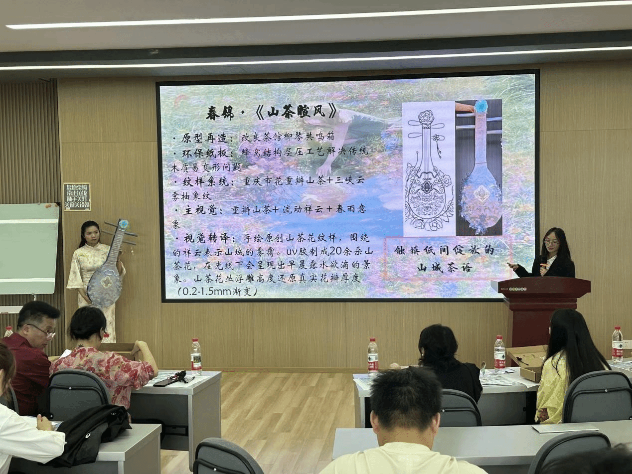 夏秀芝小组创作的《山城綦韵》办公四件套,依托綦江区非遗文化永城吹打、綦江特色美食“东溪”花生以及横山昆词等綦江特色文化内容,设计出便签、PP夹、书签和文件夹四件套,将通识教育的意义和理念体现在日常生活。温婧、陈月欣小组创作的《通识山城·民族器乐四季叙事》文创乐器模型,将重瓣山茶花、流动祥云、传统铜线纹等元素赋予春夏秋冬的季节特色,形成跨界共生的通识教育融合美学实验,解码巴渝文化民俗,文创作品现场展示惊艳四座,获得评委的一致好评。此外,其他获奖小组也带来了精彩的作品呈现,体现出对通识教育内涵的深刻理解。