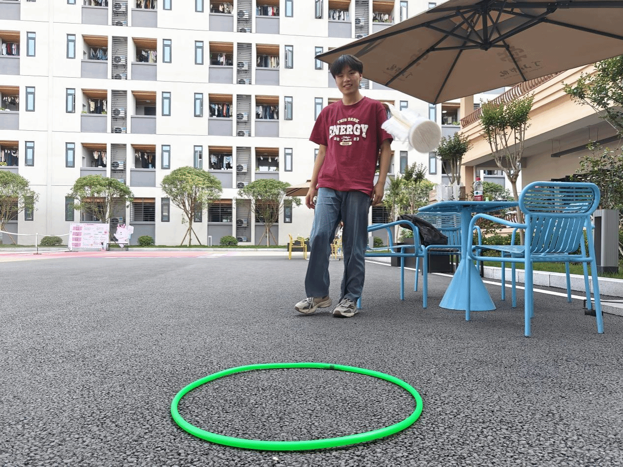从南江书院出发,同学们自主前往丁山书院中庭,迎接 “踢毽入筐” 的挑战。在三米开外的指定区域,大家根据自己的节奏调整状态。有的同学蹲下身子,仔细观察筐的位置,轻轻一脚,毽子便稳稳落入筐中;有的同学则凭借出色的爆发力,让毽子在空中划出优美弧线,精准落位。每一次成功入筐,都能收获现场阵阵喝彩,不仅锻炼了运动技巧,也提升了空间认知能力。