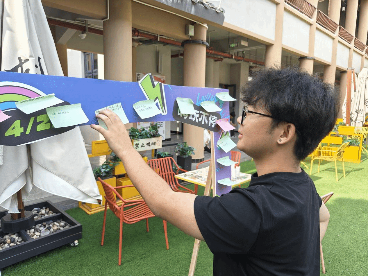 在观云书院中庭,“毽球心愿便利贴” 环节为活动增添了别样温情。完成踢毽小任务的同学,拿起便利贴,认真写下 “希望成绩更上一层楼”、“愿友谊地久天长” 等美好心愿,然后小心翼翼地贴在展示墙上,一面承载着青春梦想的 “心愿云墙” 逐渐成型。这一环节巧妙融合传统运动与文化表达,让同学们在感受校园建筑美学的同时,进一步激发对民俗运动的热爱。