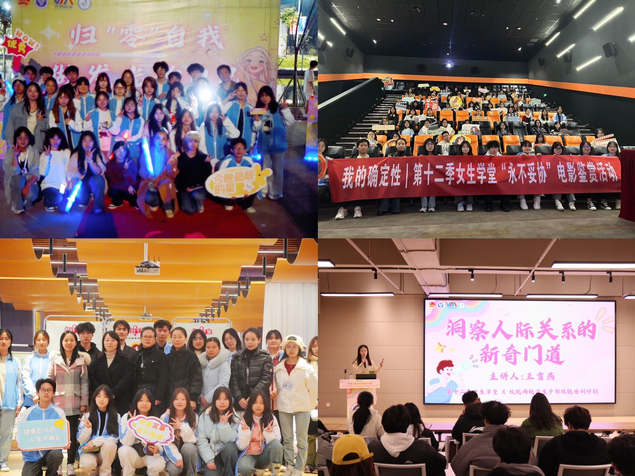 回顾本届女生学堂,以“我的确定性”为主题,校学生会权益女生部共开展了五场活动,“荧光夜市”女生学堂开幕式引导女生在任何时候都能大胆的撕掉自己身上的标签;“永不妥协”电影鉴赏让女性增强自信,给予大家在逆境中得到力量;“你好千金——女生健康中国行”讲座及义诊与同学们面对面交流,教会同学们在两性关系中要如何正确保护自己;“谷雨芳华·她探非遗魅力”活动将谷雨节气文化与传统女性智慧相融合,通过女性视角解读自然时序之美;“她屿共生”剧本杀活动暨第十二季女生学堂闭幕式通过真诚交流与共鸣,剧本承载的女性议题激发深层思考,实现情感疗愈与心灵共振,同时也为女生学堂系列活动画上了圆满的句号。