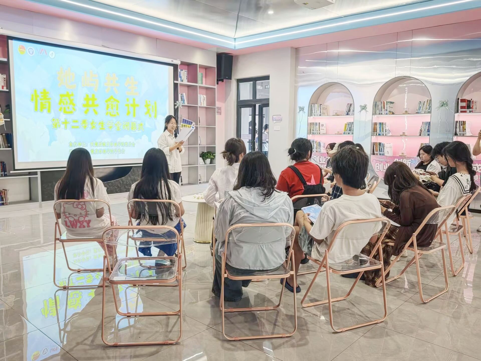 当剧本杀的灯光只为女性而亮,文字构筑的平行时空便成为解构性别桎梏的棱镜。2025年5月21日晚上18:00-20:00,由重庆移通学院学生会权益女生部在丁山书院金牛座书吧举行“她屿共生”剧本杀活动暨第十二季“女生学堂”闭幕式活动。30位女性通过全女性剧本杀《她和她的星空》,以剧本为舟、以花束为语、以誓言为灯,开启沉浸式爱自己的方式。