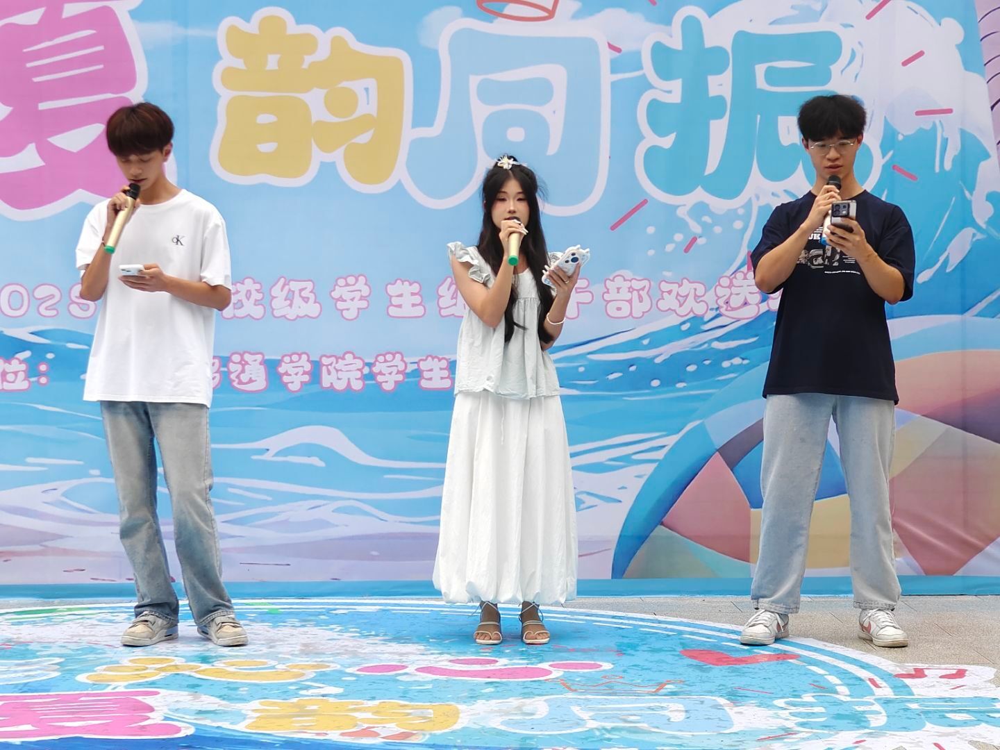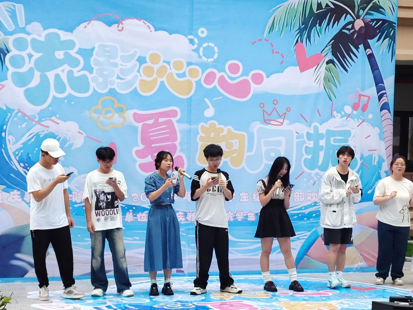 光影婆娑间,在仲夏夜舞台,学生书院联合会和学生宿舍管理委员会带来的歌曲串烧,串联过去一年的回忆;学生体育联合会和大学生艺术团为这学年画上《晴天》,校学生会和学生社团管理中心共同点亮《夜空中最亮的星》,绘制的是他们的努力与拼搏。最后团直属学生组织和青年志愿者联合会带来《我们的明天》,在美妙的和声中让我们共同期待明天,为激烈的赛事注入青春气息,树荫华盖下舞台流光溢彩,书院中庭蔓延歌声。