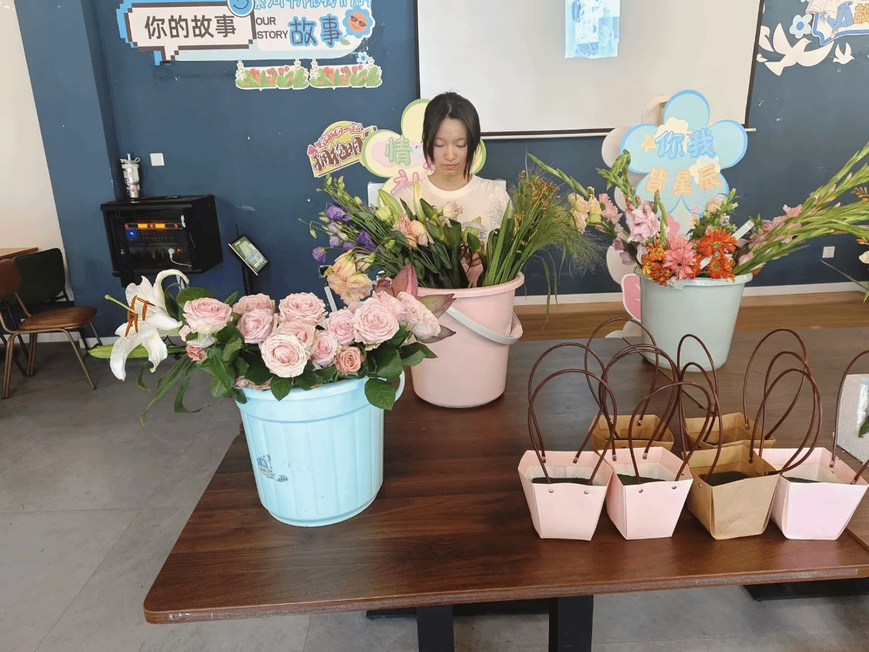 参与者们围聚在摆满花材与中式花器的桌前,化身“花艺匠人”。花卉协会成员则开启“花艺课堂”,一步步带领现场同学学习插花,理解国风插花意境,学习传统插画技巧,将鲜花插入花篮中,创作出一件件蕴含古典韵味的插花作品,让传统花艺之美绽放指尖。