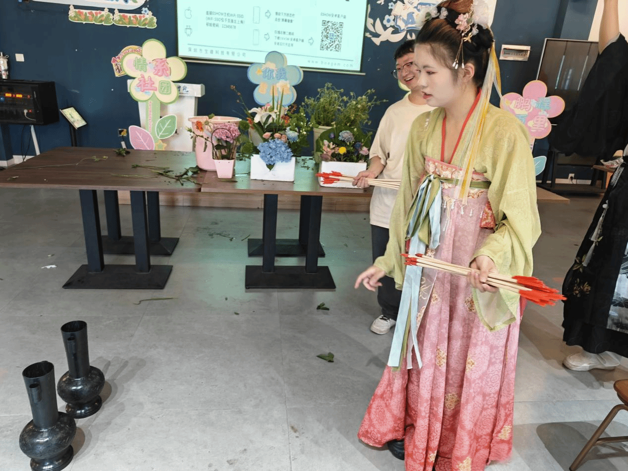 华韵汉服协会成员身着精美汉服亮相,复原小唐风齐胸襦裙、明制服饰、晋制服饰等传统服饰,与现场国风插花完美融合,瞬间将时光拉回古典岁月。此次华韵汉服协会和花卉协会的再度合作,体现了华韵汉服协会坚定不移的传承与发展中华传统服饰文化之决心,更加体现了汉服与花卉的创新结合。除此之外,华韵汉服协会的成员们还准备了传统体育项目为同学们增添乐趣,让同学们在体验完传统体育项目后,集齐印章后即可到花卉协会成员处领取鲜花。