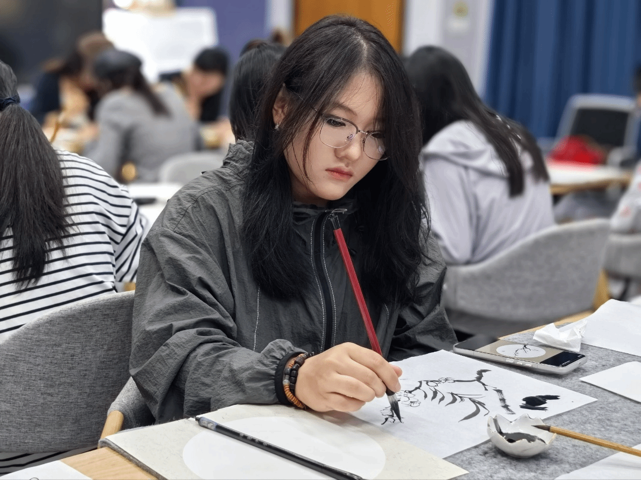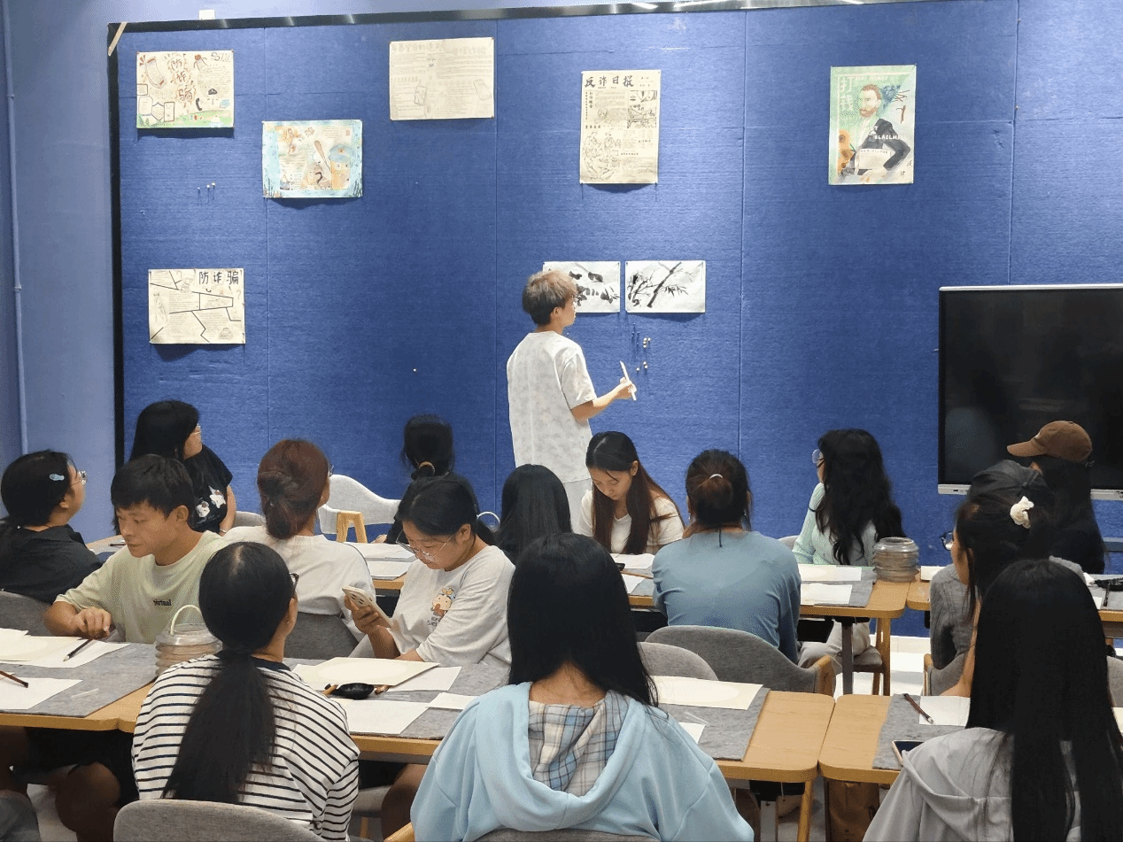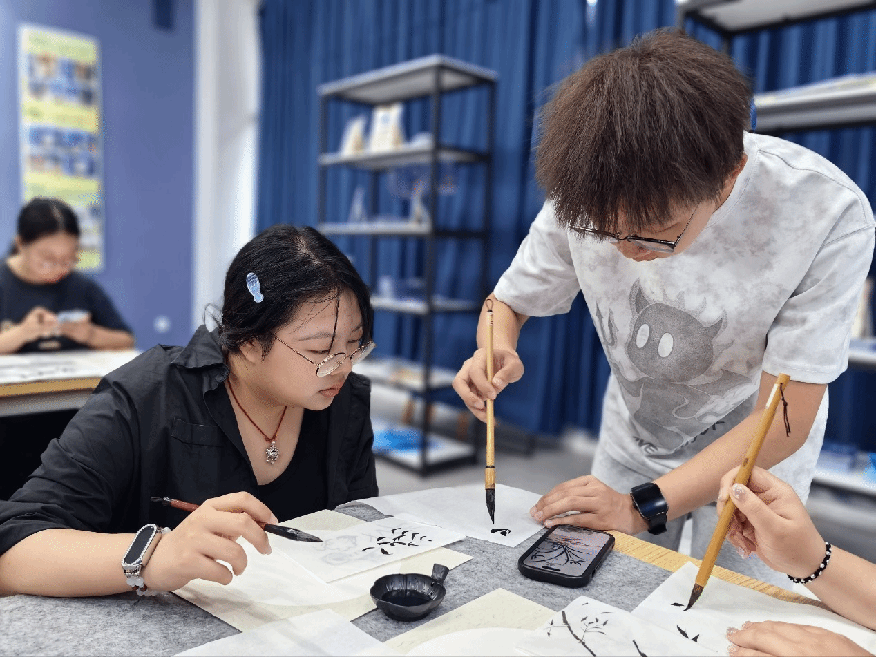 虽然手法略显生疏,但每个人都沉浸在创作的乐趣中。其间,工作人员融入参与者之中悉心指导调整布局、润色笔墨,助力学员重温笔法的技巧,让画作更具神韵。通过创作,同学们深刻感受到了水墨的独特魅力,它不仅是一种技艺,更是一种文化传承和艺术追求。