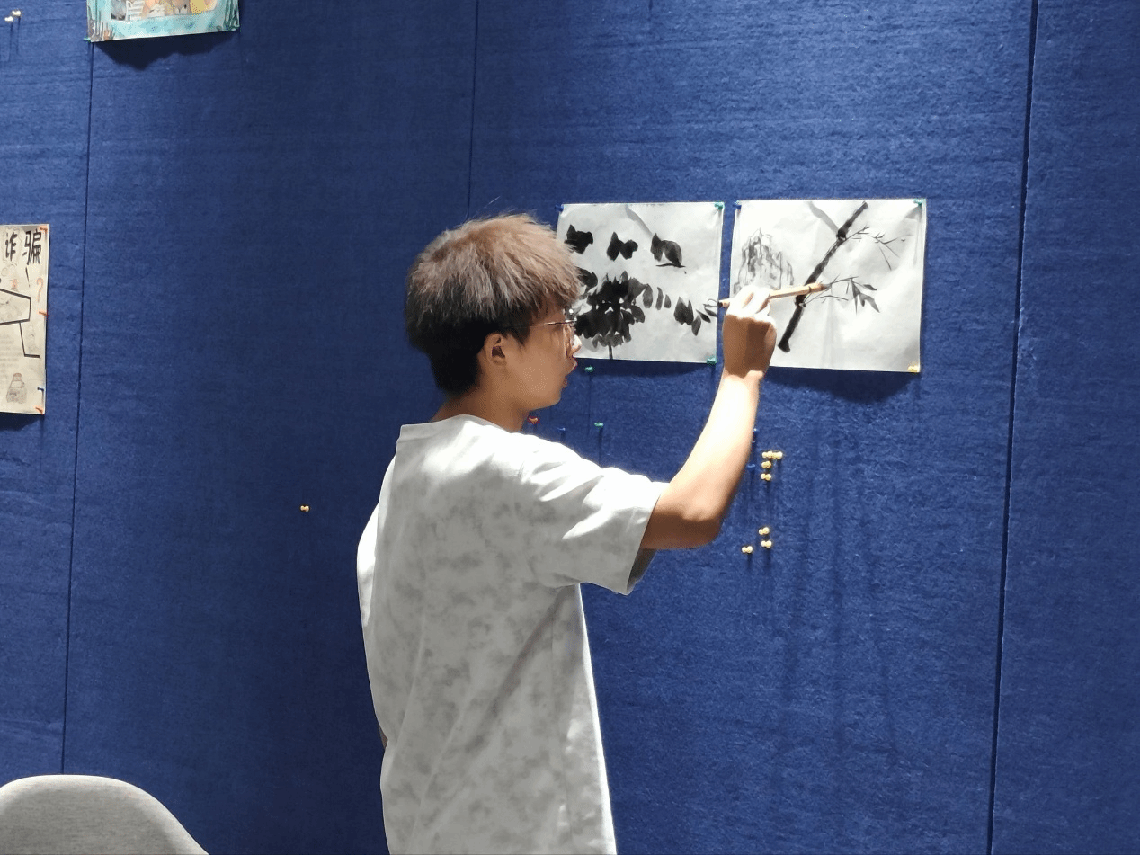 活动正酣,大家兴致高昂。参与者们先在宣纸上反复练习线条与墨色渐变,从生疏到熟练,笔尖下的黑白世界逐渐有了层次;随后拿起国画卡,以“竹影摇风”“荷映清水”为灵感,将所学墨色技巧融入创作,有的专注调配墨色,有的仔细勾勒线条。