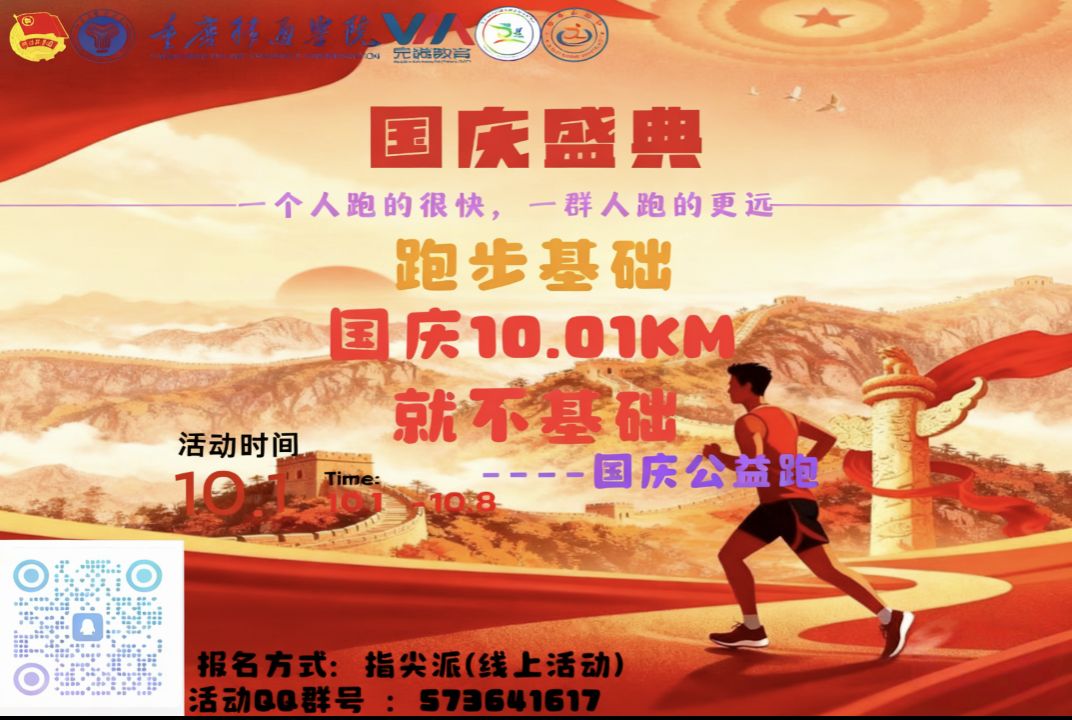 金秋送爽,丹桂飘香。为庆祝中华人民共和国成立76周年,重庆移通学院于10月1日至8日成功举办“跑步基础,10.01KM 就不基础”国庆主题公益跑活动。本次活动由共青团重庆移通学院委员会主办,移綦长跑社承办,信息安全学院青年志愿者协会协同协办,共吸引一千零一名在校学子踊跃报名参与。广大青年学生以奔跑的姿态致敬伟大祖国,以爱心的捐步传递社会温暖,生动展现了新时代大学生昂扬奋进的青春风采与深厚的家国情怀。