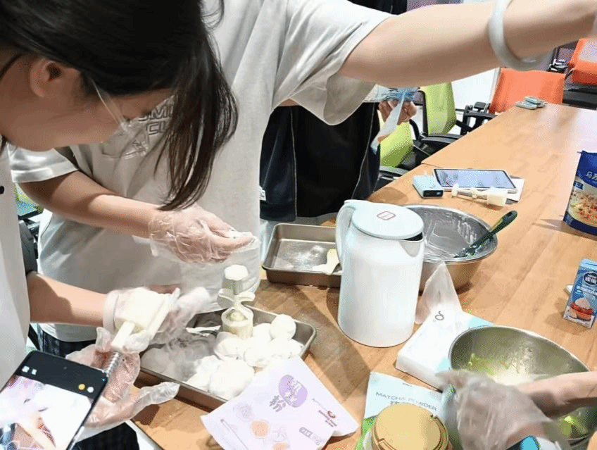 在等待冰酪酥冷藏定型的间隙,工作人员为同学们讲述了冰酪酥的文化渊源。从它在传统糕点基础上的创新演变,到成为现代秋日甜品中的 “人气担当”,同学们的思绪随着讲解穿梭,对这道甜品背后承载的饮食文化与秋日美学,有了更深刻的理解。