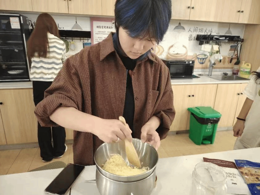 制作环节正式启动,同学们瞬间化身为专注的 “甜蜜创作者”。操作台前,有人小心翼翼地称量面粉与黄油,精准把控每一份食材的比例;有人手持搅拌器,耐心打发奶油,眼神紧紧盯着奶油从液态逐渐变得蓬松绵密;还有人尝试加入特色配料,用创意为冰酪酥增添独特风味。大家不时轻声交流技巧,分享制作心得,厨房内,搅拌器的转动声、彼此的笑声与食材的香甜气息交织,奏响了一曲温馨的秋日美食乐章。
