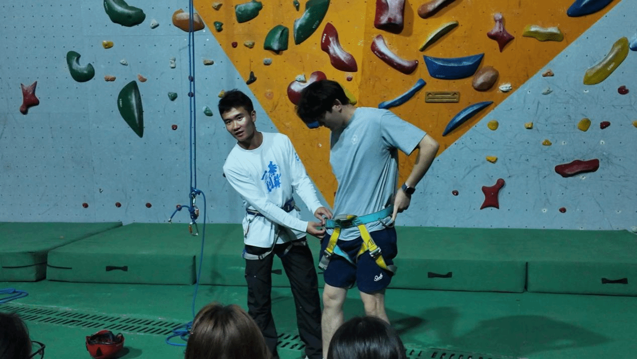 活动伊始,由初级攀岩社会体育指导员、攀岩裁判员李孟松为参赛者们进行详细的安全讲解和攀岩技巧培训,社团指导老师王欣、闫定才、王越全程统筹,把控全局。其中李孟松对攀岩过程中的安全要点作出重要强调,包括如何正确穿戴安全带及头盔、合理运用手脚力量以及在遇到突发情况时的应对措施等。在讲解的同时,他也对一些基本的攀岩动作作出示范,展示如何找到合适的着力点、怎样利用身体重心的转移来实现高效攀爬等。参与者们摩拳擦掌,跃跃欲试,想要一展风采。