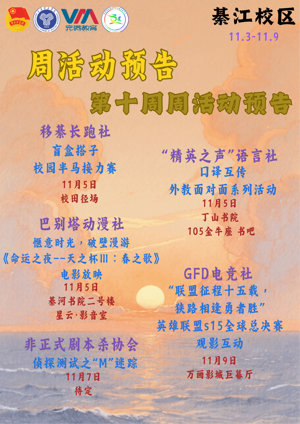 社团精彩不停步,更多惊喜已就位!第十周,期待和每一位同学温暖相遇,一起沉浸在这份鲜活的青春社团时光里,解锁更多快乐!