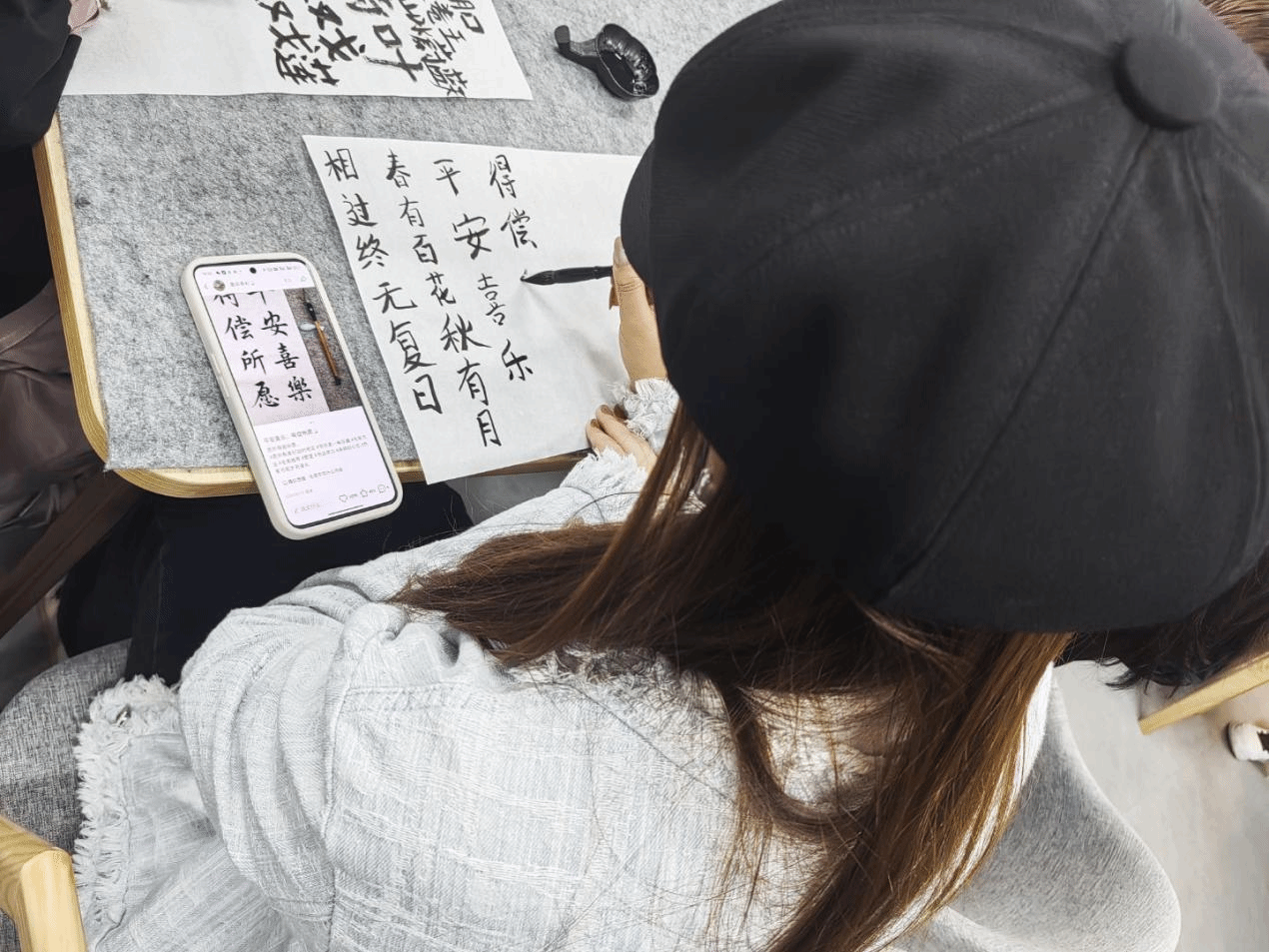 青花墨字书画社于10月22日,在綦河书院一号楼长风・交流空间开展第五期书法小课堂,以“欲知且试,所念所得”为主题,以“实用与美感兼备”的代表,邀学子共探笔墨间的古人智慧与浪漫。同学们围绕书法作品展开热烈讨论,有人分享对笔墨韵味的理解,有人畅谈创作时的灵感迸发。每当有人举起自己的作品展示,周围便响起阵阵交流声,大家相互点评、交换想法,墨香里满是对书法艺术的热爱。