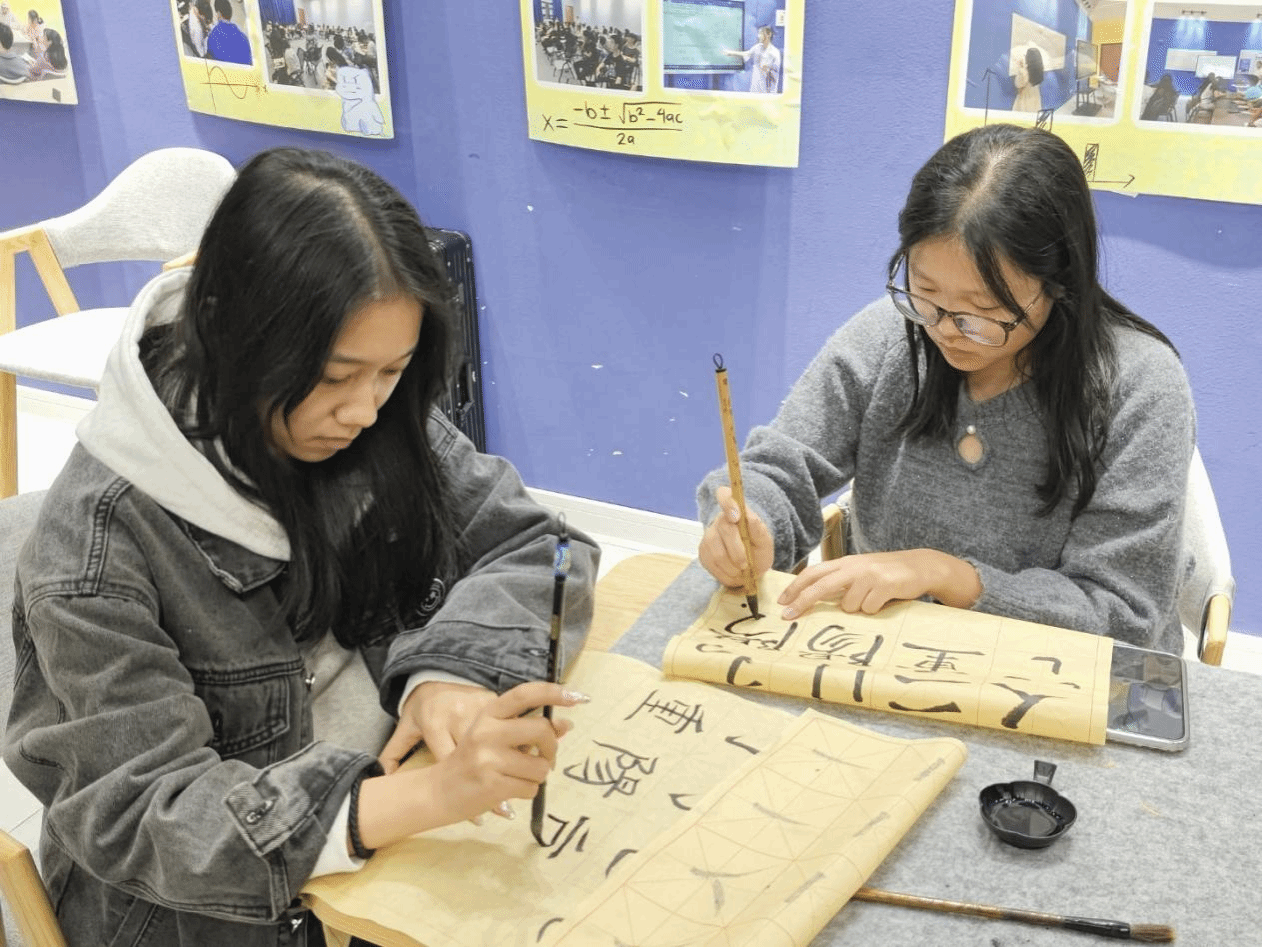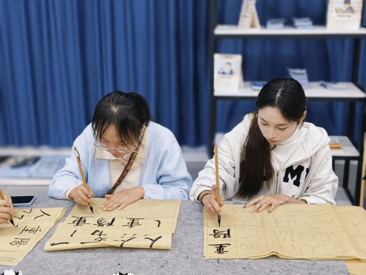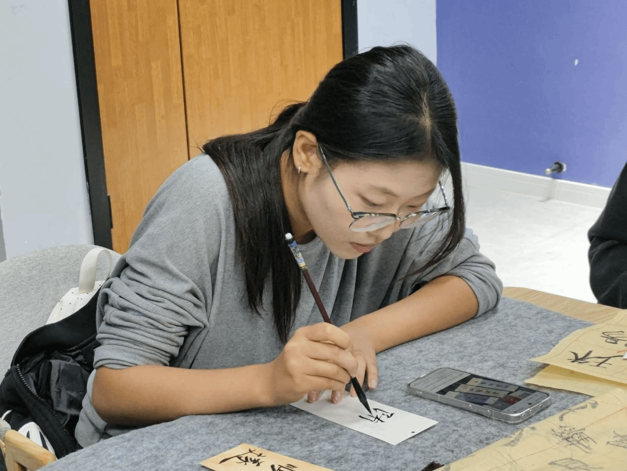 在充分领略了书法之美后,活动进入了实践创作环节。参与者们纷纷执笔、蘸墨,在宣纸上认真临摹与创作。活动现场墨香四溢,工作人员穿梭其间,为同学们提供细致的指导,及时纠正执笔姿势或运笔方式,帮助大家更好地完成一幅幅承载着重阳温度与个人情意的书法作品。