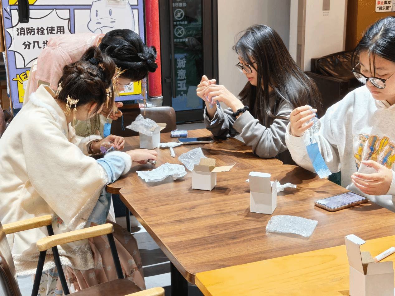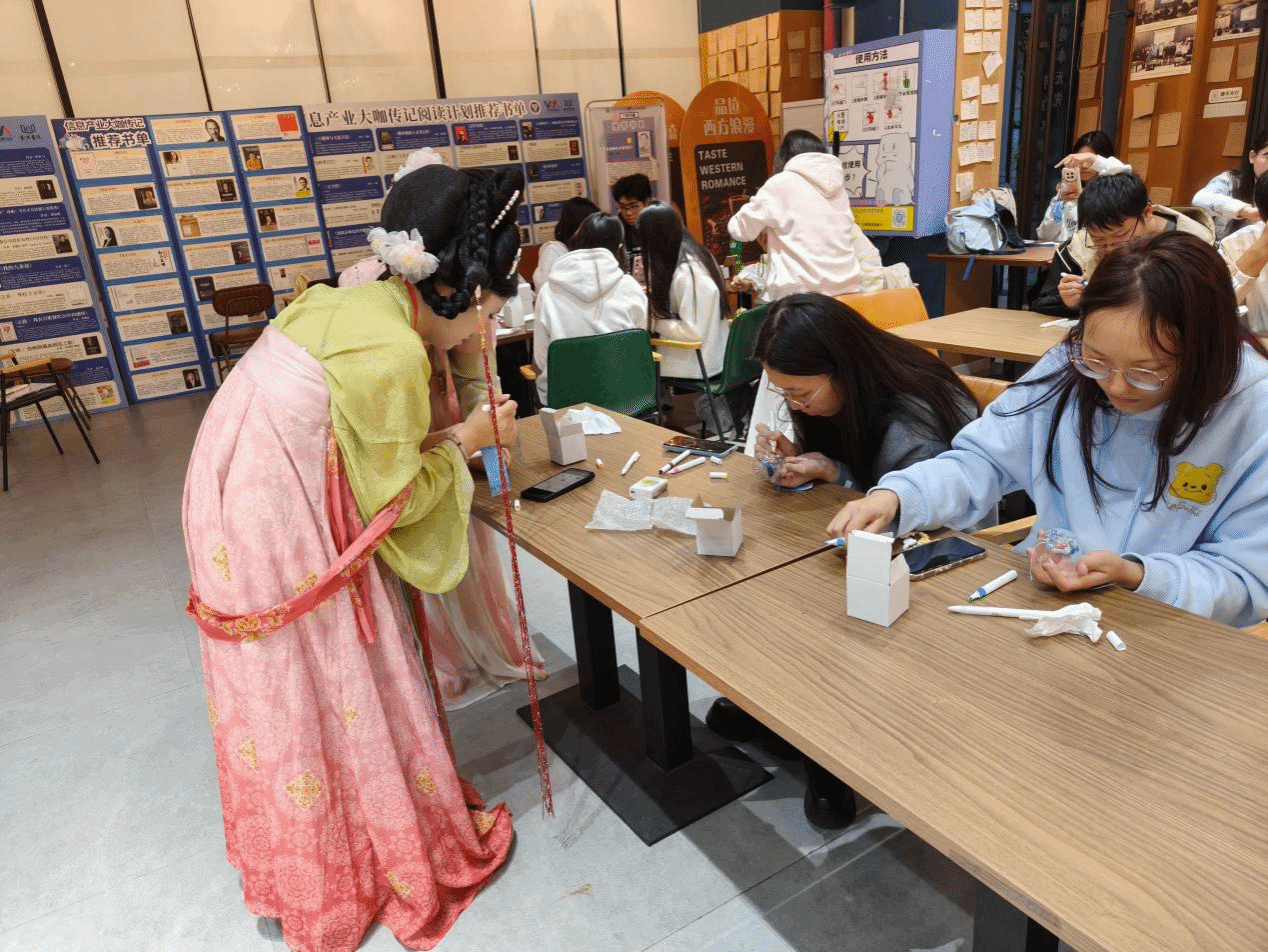 活动正式开始后,花卉协会的负责人通过PPT生动讲解了风铃的历史文化、制作步骤及创意搭配技巧,让参与者们对风铃制作有了系统的认知。随后,华韵汉服协会的成员身着典雅的传统服饰登场,瞬间为现场增添了浓厚的传统文化气息,他们与参与者们一对一交流指导,耐心解答大家在裁剪、粘贴、穿线过程中遇到的问题。
