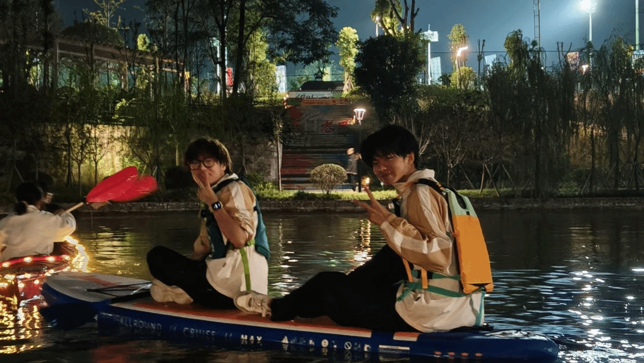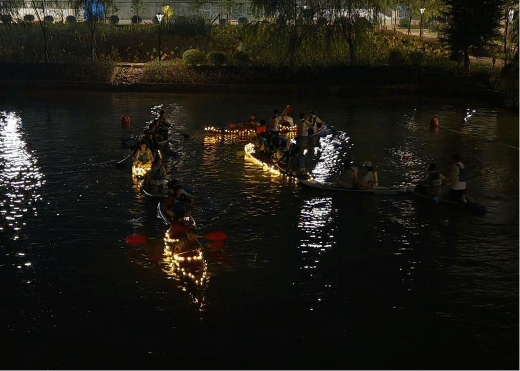 晚上19时10分,随着王教练一声“彩灯管够”,岸边瞬间点亮绚烂光影。同学们纷纷拿起五彩灯带,尽情装点自己的桨板——星星灯串、彩色浮漂、创意图案……各式装扮尽显移通学子的奇思妙想。大家或坐或卧,惬意漂浮于湖面,任微风轻拂耳畔,静赏天上明月,忘却平日琐碎。水面泛起