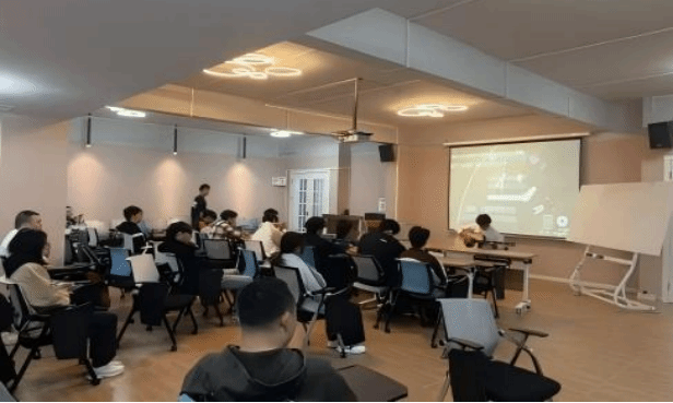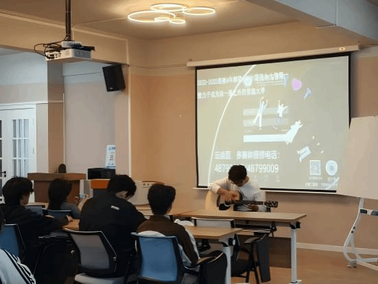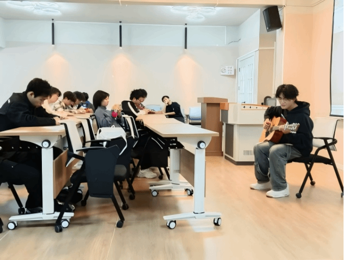 10月24日14时,綦河书院二号楼小石潭・多功能活动室内暖意融融,由博雅协会与STAR音乐根据地联合承办的 “指尖跃动,弦音治愈”民谣吉他沉浸式体验音乐会正式开启。40名来自全校不同专业的学生齐聚于此,25名有吉他基础的参与者手持乐器围坐成圈,15名观众在旁侧轻声交流,空气中已提前弥漫着对音乐的期待。