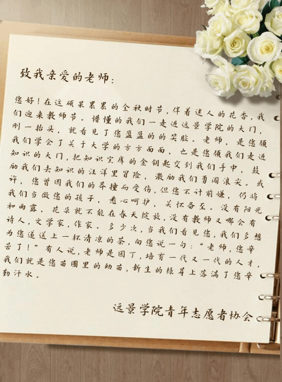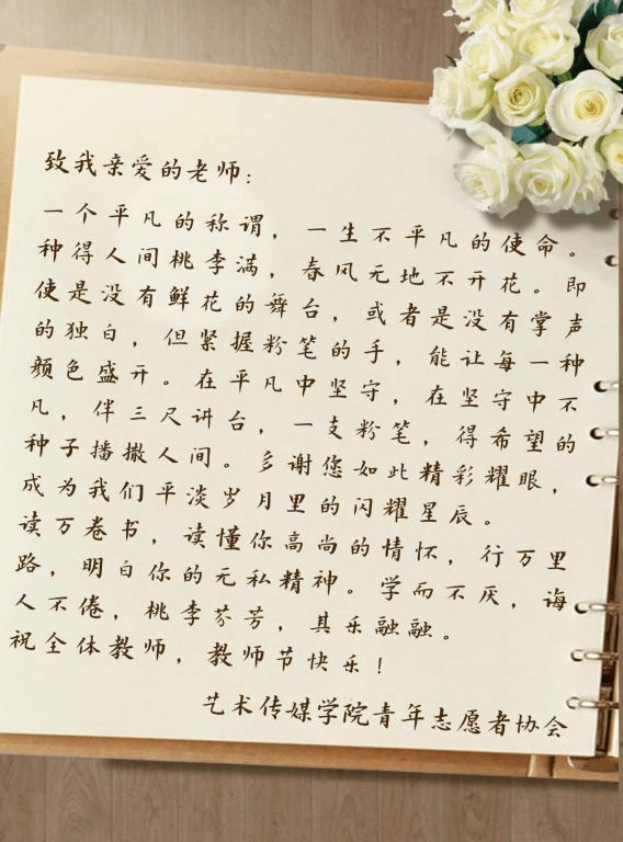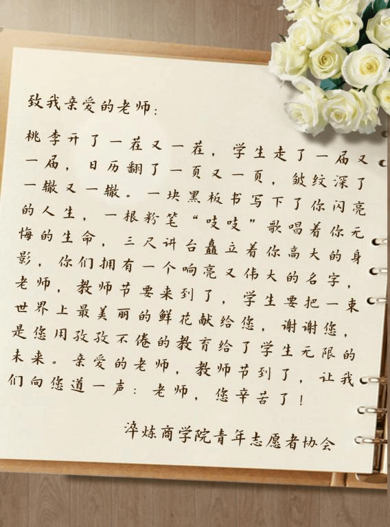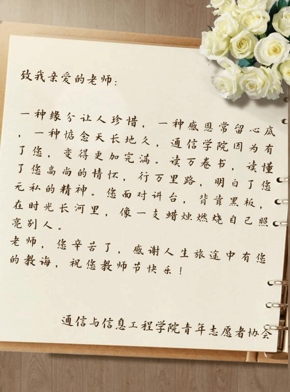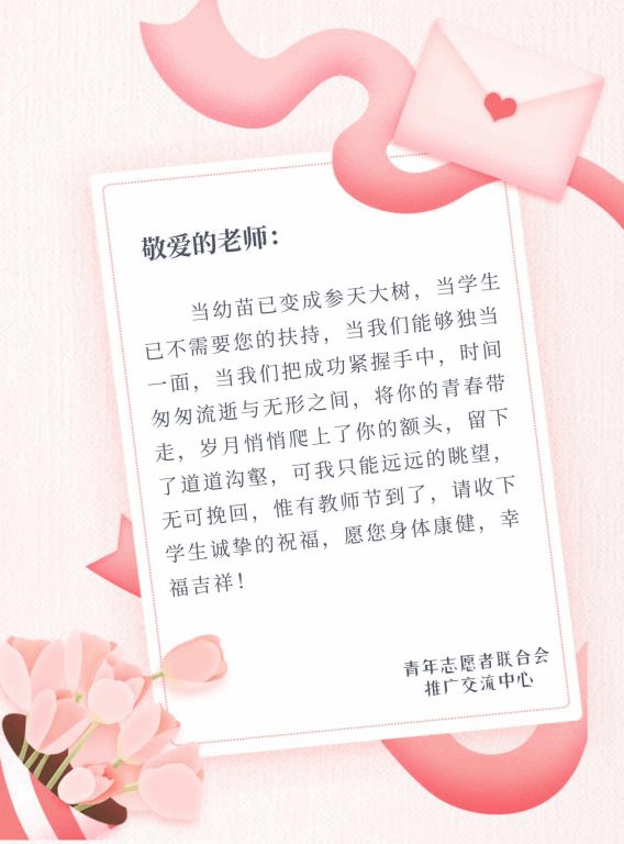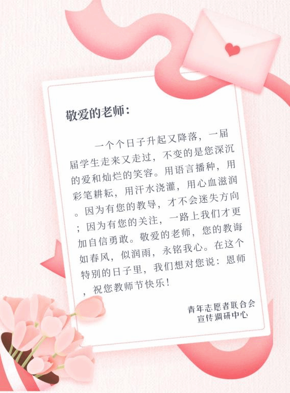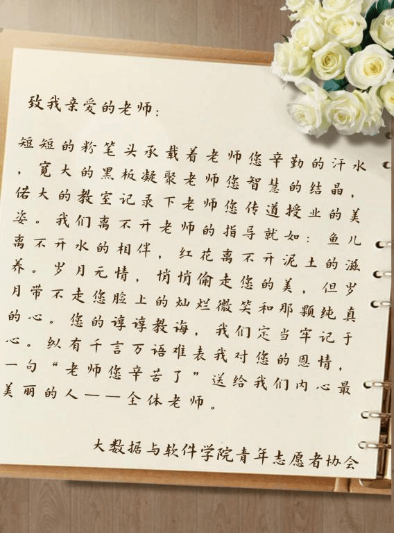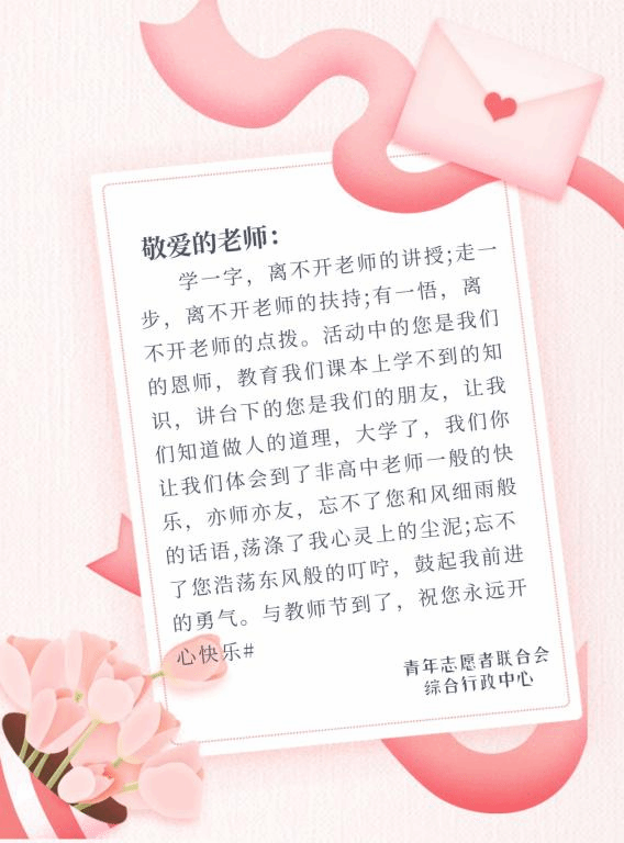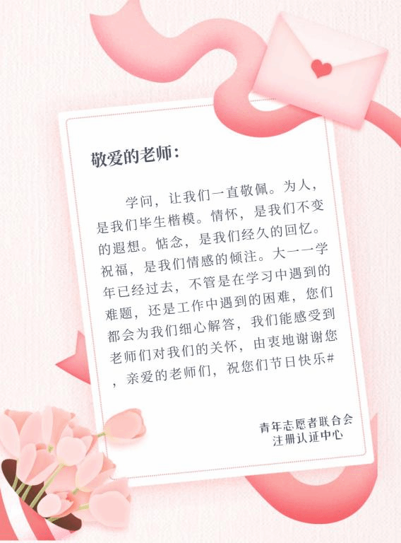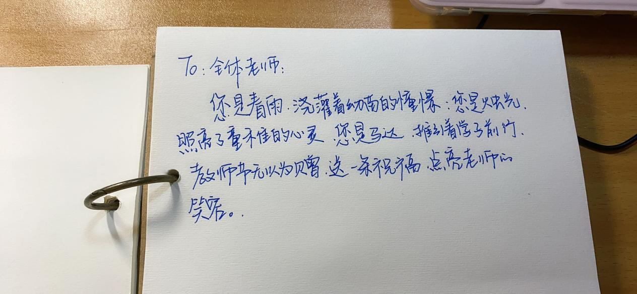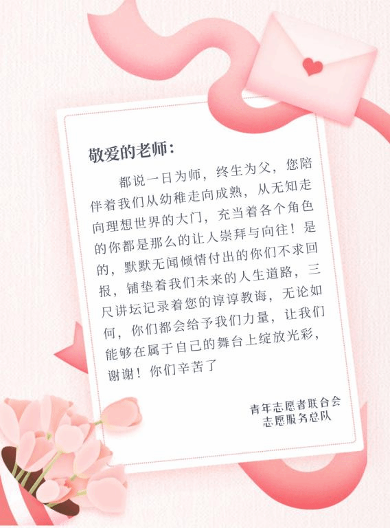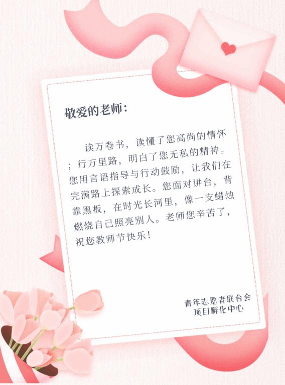 师恩如山,师恩似海。值此教师节来临,青年志愿者联合会开展了以“桃李满天下,金秋谢师恩”为主题的教师节志愿服务活动。志愿者们向各位老师发起温暖告白,以短信的形式为全校教师送去祝福,并向老师们赠送精心准备的手写贺卡,以表达青年志愿者联合会全体成员对老师的崇高敬意和诚挚的祝福。
