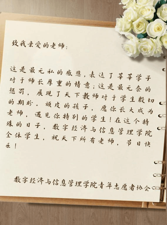 教师节将至,怀揣着对老师们的尊敬与感激。2021年9月9日,数字经济与信息管理学院青年志愿者协会组织志愿者开展“金秋九月,感谢师恩”活动。此次活动共分为线上线下两个部分,从不同角度充分表达对老师的感激之情。