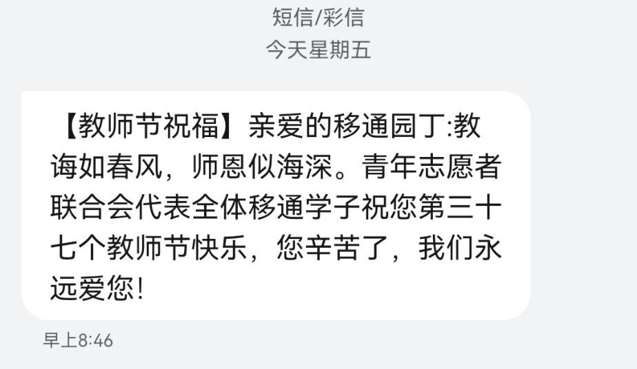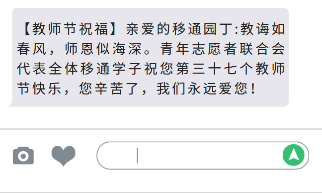 “感谢您如此精彩耀眼,做我们平淡岁月里的星辰”,在移通校园里,许许多多的老师都在用自己独特的风采,坚守着最朴实而美好的教育理想。“千师千面”,老师们用自己独特的“一面”,共同刻画了教育人珍贵而美好的“一面”。他们耕耘在教育的沃土,成为祖国之花的培养者。在此,让志愿者们向全体移通教师送上最真挚的祝福:老师,祝您教师节快乐!