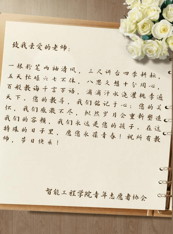 一朝沐杏雨,终身念师恩。智能工程学院青年志愿者协会通过“特别的爱给特别的你”教师节系列活动,为老师送上一份最贴心的感恩盛宴。节日当天为老师送去短信祝福语、为来校执教十年的教师进行专访、为老师制作一张简易的贺卡,卡片小表心意,礼物轻谢恩师。老师的一句寄语、一条学习建议,都将是每一位移通学子以后前进路上的无限动力。言语难表感激,唯以实际行动表达敬意。