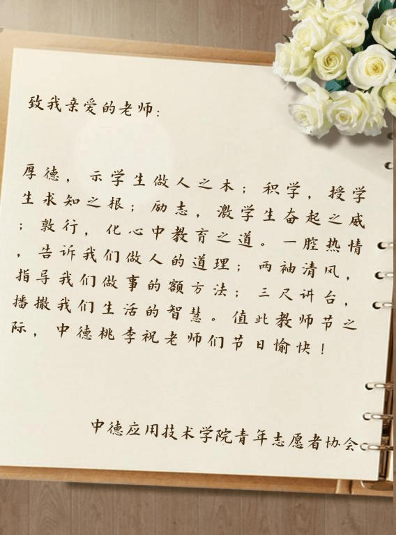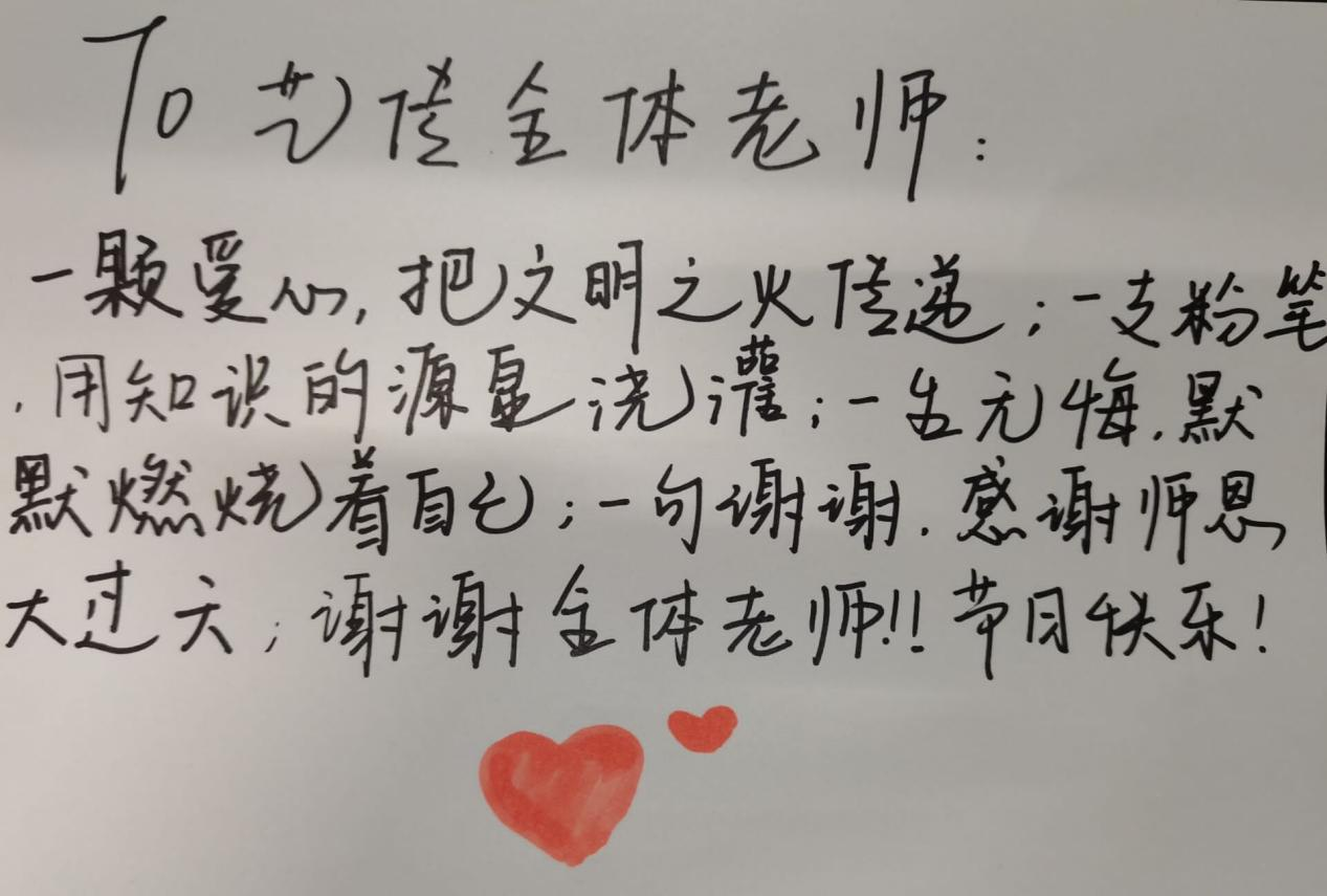 用爱心浇灌花朵,用双手播种希望,用智慧创造未来,老师是人类灵魂的工程师。在这个崇高的节日里,为了体现对老师诚挚的祝福感激之情,中德应用技术学院号召学生写下最美的文字,献给最敬爱的老师。饮其流者怀其源,学其成时念吾师。志愿者们纷纷通过送花、写贺卡、写邮件、发短信等方式向恩师传递了莘莘学子们最真诚的祝福,以真诚的感恩行动伴随着我校教师度过了一个温暖贴心的教师节!