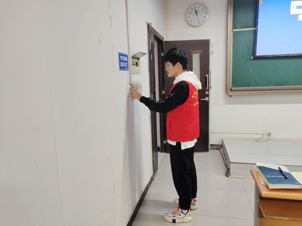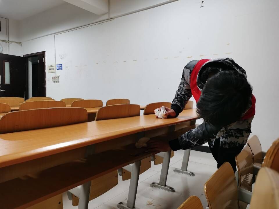 为便于活动的顺利展开,志愿者们由支队长分为三个小组,分别对第一教学楼、第七教学楼和第四教学楼进行清洁打扫。待到分配工作落实后,志愿者们怀揣着激动的心情,整理好红马甲,便开始分头行动。进入不同教学楼后,每位志愿者各司其职,红色身影穿梭在各教学楼的楼道中,对每个教室同学们遗留下的垃圾进行清理、擦拭黑板等常规的清洁活动,并对每个教室电源的关闭情况进行着重检查,确保节约每度电。