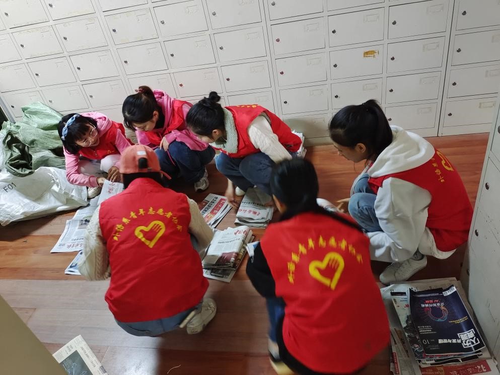 志愿者们按照老师的要求将报纸分类整理。志愿者们敏捷的身手,使得活动开展的非常迅速。活动进入最后一阶段——送报。志愿者们迎着风走在校园里,各个角落都有一抹靓丽的红色,学校的绿植更能衬托出志愿者的热情似火,青春的颜色更如那一抹红,应更加向那抹红色靠拢。