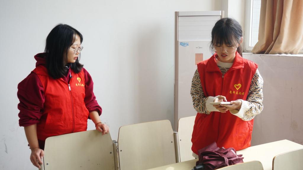 志愿者们通常身穿红色马甲,在每一栋教学楼、每一间教室、每一个角落都有他们身影。他们弓着身躯在每一排座位前细心查看,不放过一丝缝隙。他们用那一颗满怀热情和希望的心,为丢失物品的同学们重新拾回了了希望和信心。志愿者们通过对各个教室进行检查也发现了不少同学们落下的物品,志愿者们的出现,同学们不再因丢失重要物品时而焦躁不安,他们都会冷静、镇定的找志愿者们寻求帮助,志愿者们也会给他们一个满意的答案。