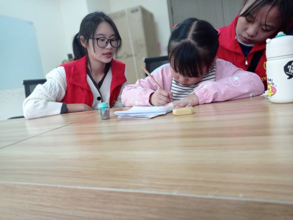 当然,在英语小课堂期间,志愿者们也会不可避免地遇到一些小难题。小朋友们爱闹的天性在有了同龄玩伴之后得到释放,课堂上不免有些吵闹,教学助手们帮助小老师管理纪律,小老师也通过和小朋友们玩“123木头人”的小游戏使课堂安静下来。