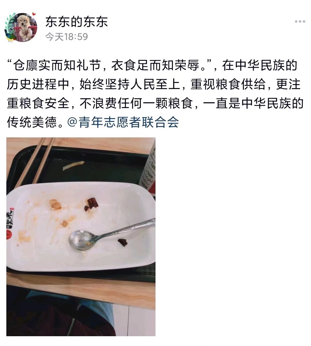所谓实践出真知,103名志愿者报名参与了“食堂的一天”志愿服务活动,大家在活动中亲身体验餐盘回收、餐桌清理等工作,在活动过程中为食堂阿姨提供了帮助。志愿者们通过实践,深感我校粮食浪费严重,以及用餐后餐桌的脏乱,大家对自身的文明规范有了更深层次的认识与要求。与此同时,我校共计2376人参与做一个有“粮”心的人志愿服务活动中,他们通过光盘打卡的实际行动,引领着我校节约粮食之风的建立,为共同建设文明、和谐、“粮”心的校园环境作出贡献!