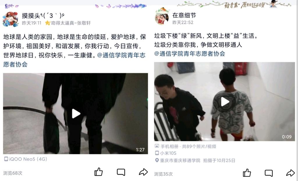 垃圾下楼是推动形成绿色发展方式和生活方式的第一步,一方面能提高同学们的环保意识,营造整洁,舒适健康的学习生活环境,另一方面便于环卫工人的后期清理工作。活动面向全校征集移通学子垃圾下楼的视频,“垃圾下楼,我在行动”、“楼道整洁由我守护”等标语竞相出现在朋友圈,以此潜移默化地提高同学们的环保意识,引领同学们将书院垃圾带下楼。