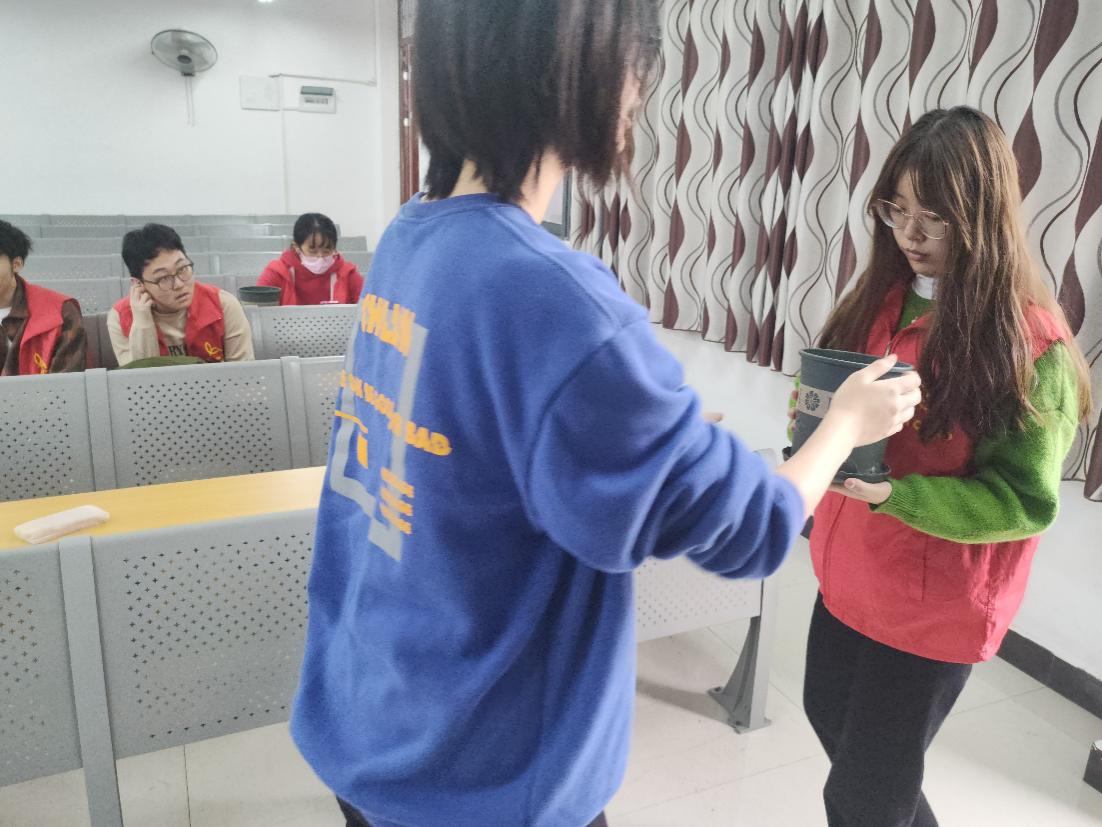 活动进行到中场时,同学们的眼中已经充满了期待与信心。经过一定的学习,同学们都对波斯菊的栽培有了一定的认识,都充满了能培养出一盆繁茂的波斯菊的信心;看着同学在主持人和盆栽之间不停游走的眼神,可以看出同学们想要领取盆栽的心已经迫不及待了,随后为每一个寝室代表分发了一个花盆以及波斯菊的种子,同学们庄重的接过盆栽,眼中的喜悦与期待溢于言表。