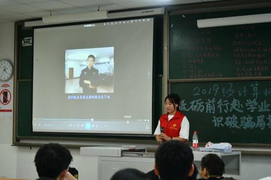 随着互联网新技术新业态的迅猛发展,网络诈骗严重影响着人民群众的安全感。为提高大学生安全防范意识,杜绝校园诈骗情况的发生。2021年9月22日,大数据与软件学院“小心防诈骗·安全零距离”志愿服务专项支队在2019级计算机科学与技术年级会开展防贷诈骗宣讲会。