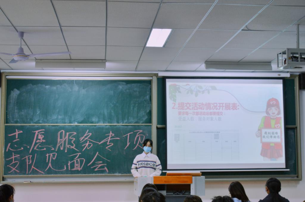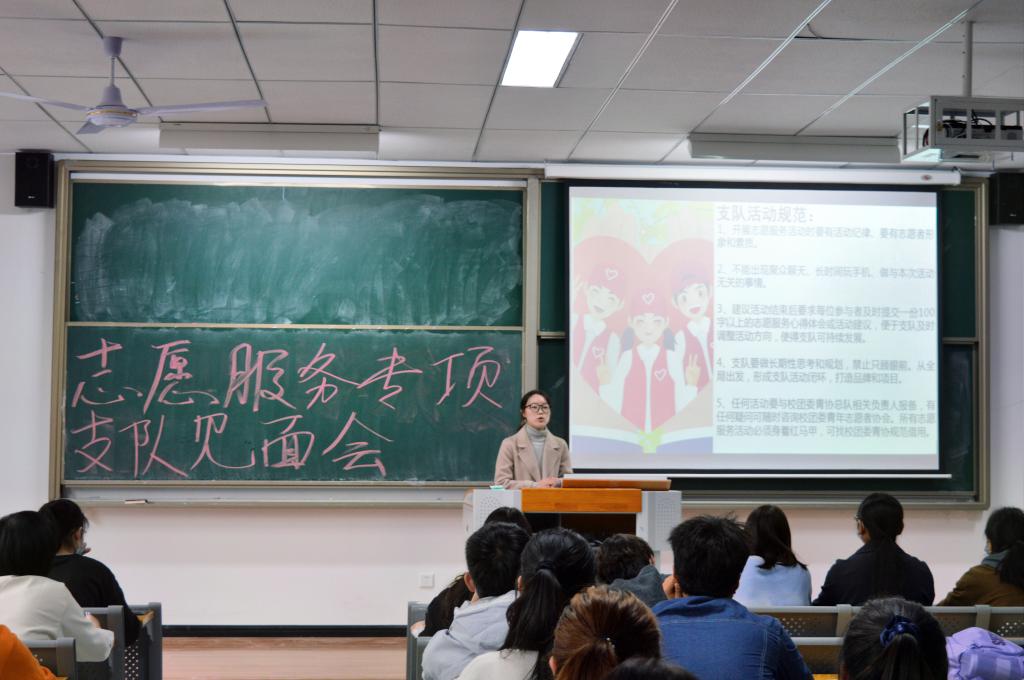 校团委青年志愿者协会总队秦瑶同学为各支队临时负责人讲解了有关支队活动规范条例,包括按时向总队提交活动方案,活动数据,活动开展情况等内容。通过活动情况调查,对各支队活动方向加强了解,及时做好调整规划,对近期支队活动开展工作进行统一部署,并提出本学年工作重心在于打造校内志愿服务,今后将共同为志愿服务注入新活力,让爱心延续,让志愿继续发光发热。