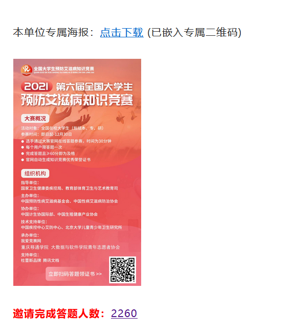 高校防艾是面向全体师生进行防艾知识宣传的公益活动,为打造无艾社会助力,同时也为积极响应2021年“青年艾不爱”高校社团参与艾滋病宣教活动的号召,大数据与软件学院通过官方微博、微信公众号、抖音、QQ说说以及各年级群等多渠道宣传此次活动,参与活动共计2260余人。
