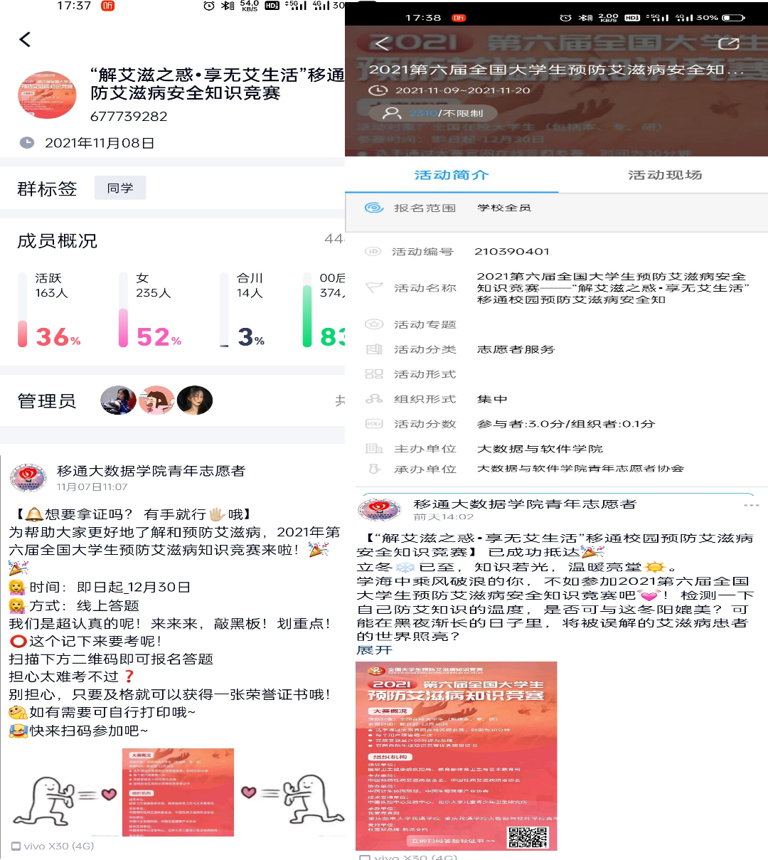 为增强我校学生对艾滋病的了解,提升同学们防艾和自我保护意识,引导同学们形成健康、积极的生活方式。2021年11月9日至11日,大数据与软件学院青年志愿者协会借助《2021年第六届全国大学生预防艾滋病知识竞赛》开展了以“解艾滋之惑·享无艾生活”移通校园预防艾滋病安全知识竞赛。