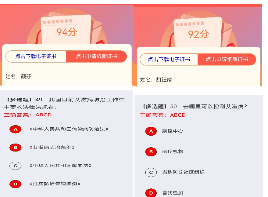 自检艾,懂得艾。线上竞赛考题包括单选题和多选题两部分,覆盖了防艾传播方式、如何预防艾滋病、艾滋病的易感人群等内容。艾滋病自我检测的好处?去哪里可以检测艾滋病?哪种样本不能用于HIV检测?一个个问题科学、准确的检验同学们对艾滋病相关知识的掌握情况。同学们在答题的过程中,潜移默化地深入了解了艾滋病的相关知识。答题结束后,志愿者还组织同学们学习错题,弥补同学们关于艾滋病所缺方的相关知识,提高同学们的防艾意识。