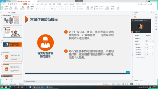为了使学生熟悉生活中常见的诈骗形式,增强学生防范意识,提高学生自我预防、自我保护、自我应对能力。2021年10月27日,大数据与软件学院青年志愿者对2021级计算机科学与技术开展以“感恩红色精神 争做时代青年”为主题防诈年级会,共计280人参与其中。