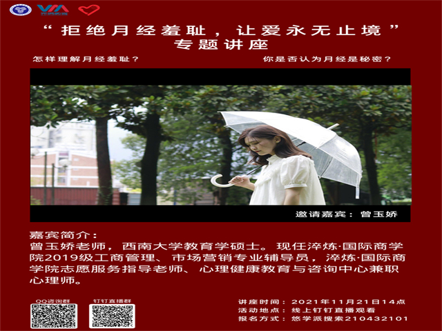 11月21日,淬炼青协组织开展了“拒绝月经羞耻,让爱永无止境”线上主题讲座,讲座由志愿服务指导老师曾玉娇主讲。曾老师从“打破传统,正视生理期”、“跳出桎梏,拒绝羞耻观”和“予她同行,汇聚‘她力量’”三个方面为同学们具体讲述了拒绝月经羞耻的观念和正视自我角色的意识,她号召直播间的女同学门要争做有朝气、有激情、有能量的青年学子,汇聚有动力、有能力、有魄力的“她力量”,勇做有思想、有价值、有前途的新时代独立女性,用智慧开创自己的非凡人生。此次关爱女性主题讲座共计吸引双校区500余人参与,“拒绝月经羞耻”的主题引发了直播间广大同学的热议,“独立女性”的话题更是掀起激烈的讨论。