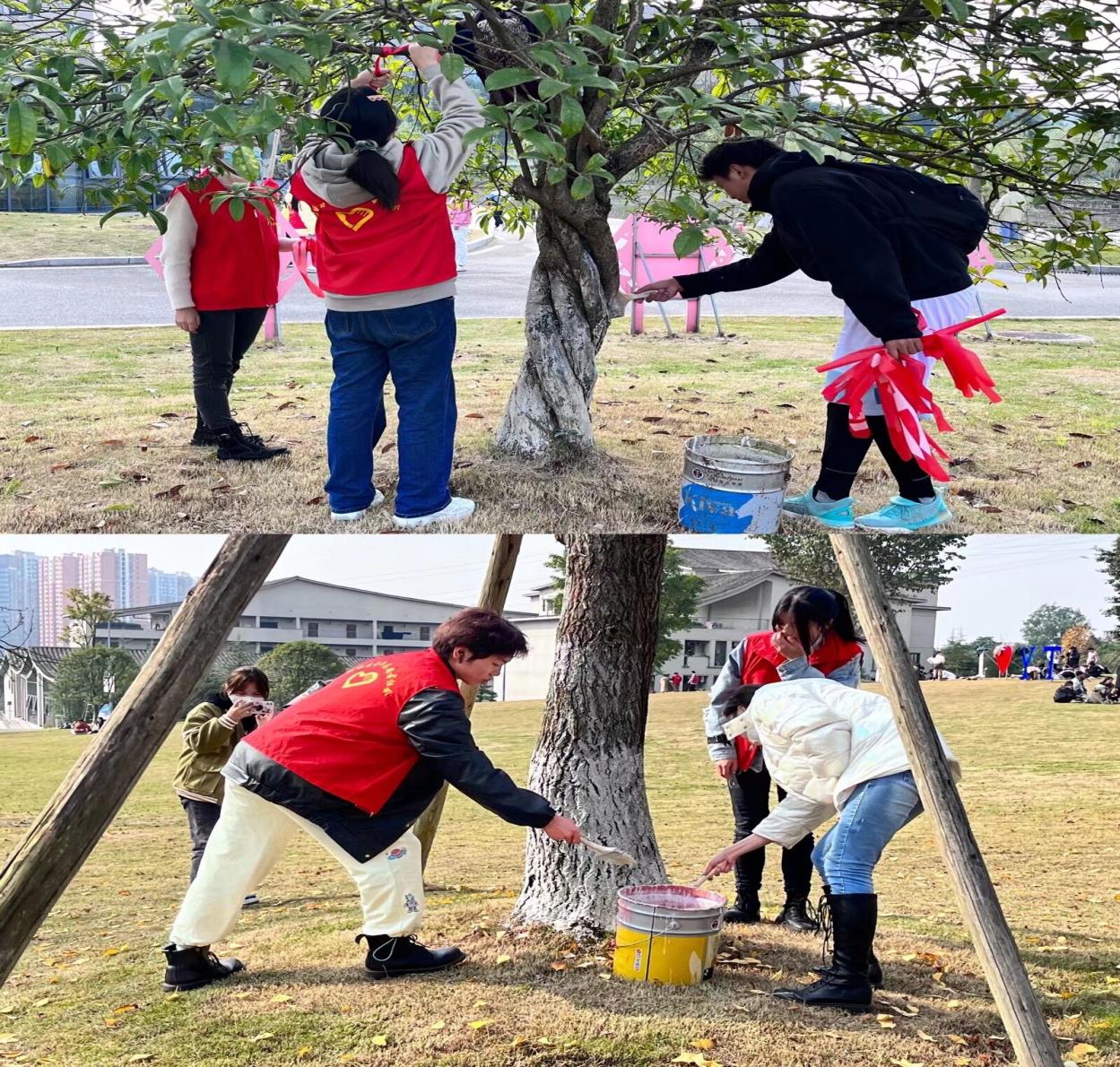 活动开始后,志愿者们自行分工。两两协作,一起将装满石灰水的桶提到树前。他们手持刷子在自己的区域活动,先用准备好的石灰水将树干刷白,然后满怀期待将红丝带系在树干上,象征美好,寄予希望。志愿者们配合默契,井井有条。手法娴熟地完成着一道道工序。之前的生疏氛围很快被欢声笑语冲散,让行者公园变得温暖了许多。