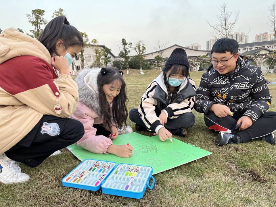 活动进入了最后环节,同学们通过报数分成了4个小组。每小组4个人,分别需要在纸板上绘画岛屿,再结合4 人绘画的内容设计出与岛屿相关的岛名,并选出一名岛主向同学们介绍他们是如何构建出这座岛屿,为什么要在岛屿上画这些东西以及画这座岛屿的意义,随后同学们充分发挥想象力和组员们相互配合画出了属于他们自己的岛屿。