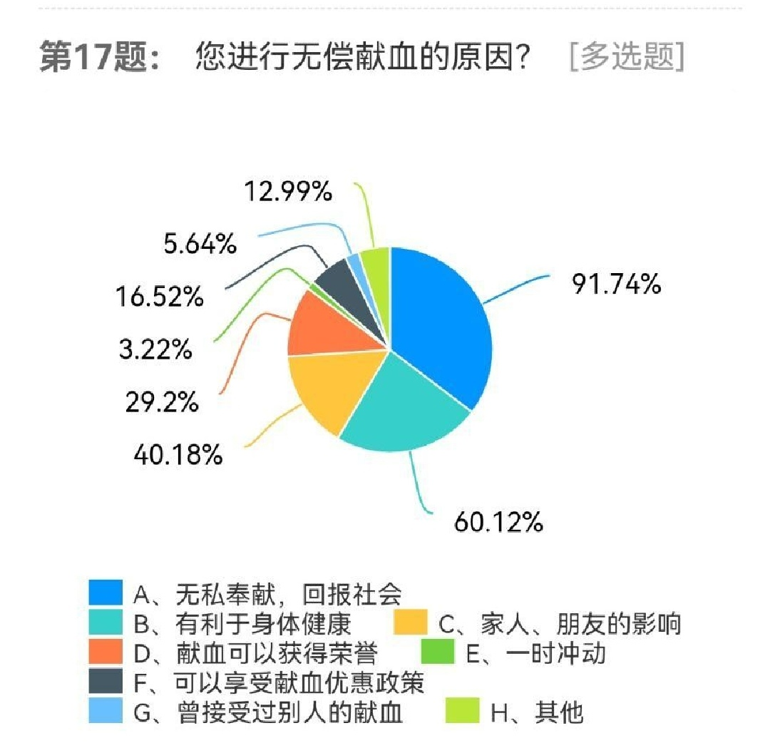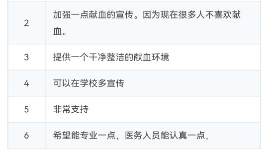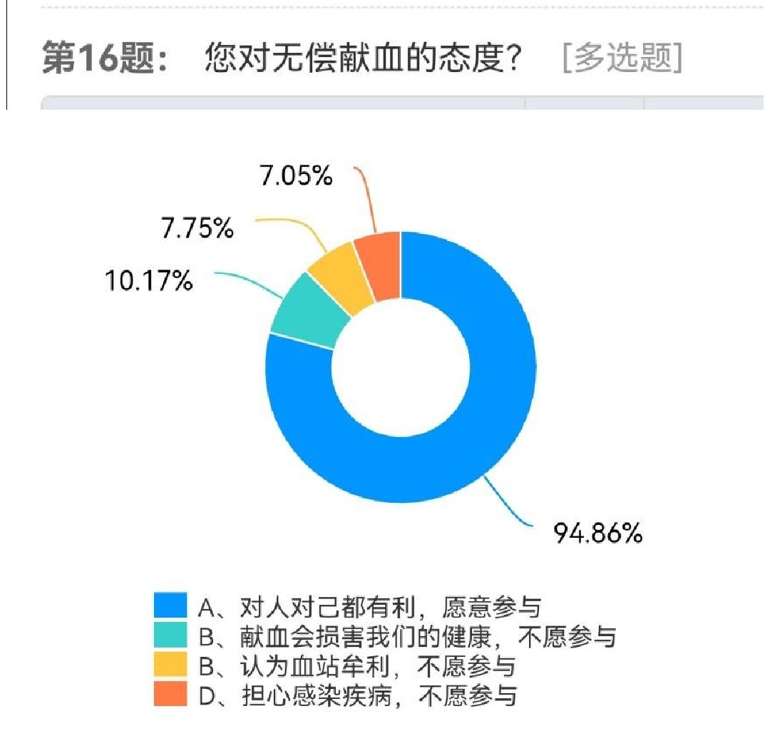 在献血前期,志愿者为了解同学们对献血知识的掌握情况,学习到更多的献血知识,重视满意度调查,不断提高献血服务质量,促进无偿献血事业积极发展。在问卷中,94.86%的同学对无偿献血保持主动积极的态度,91.74%的同学献血的目的是无私奉献,报答社会,体现了移通师生温暖有爱的普遍特征,大家积极为血站提建议,力争为献血者提供更优质的志愿服务,保障献血活动有序的开展。