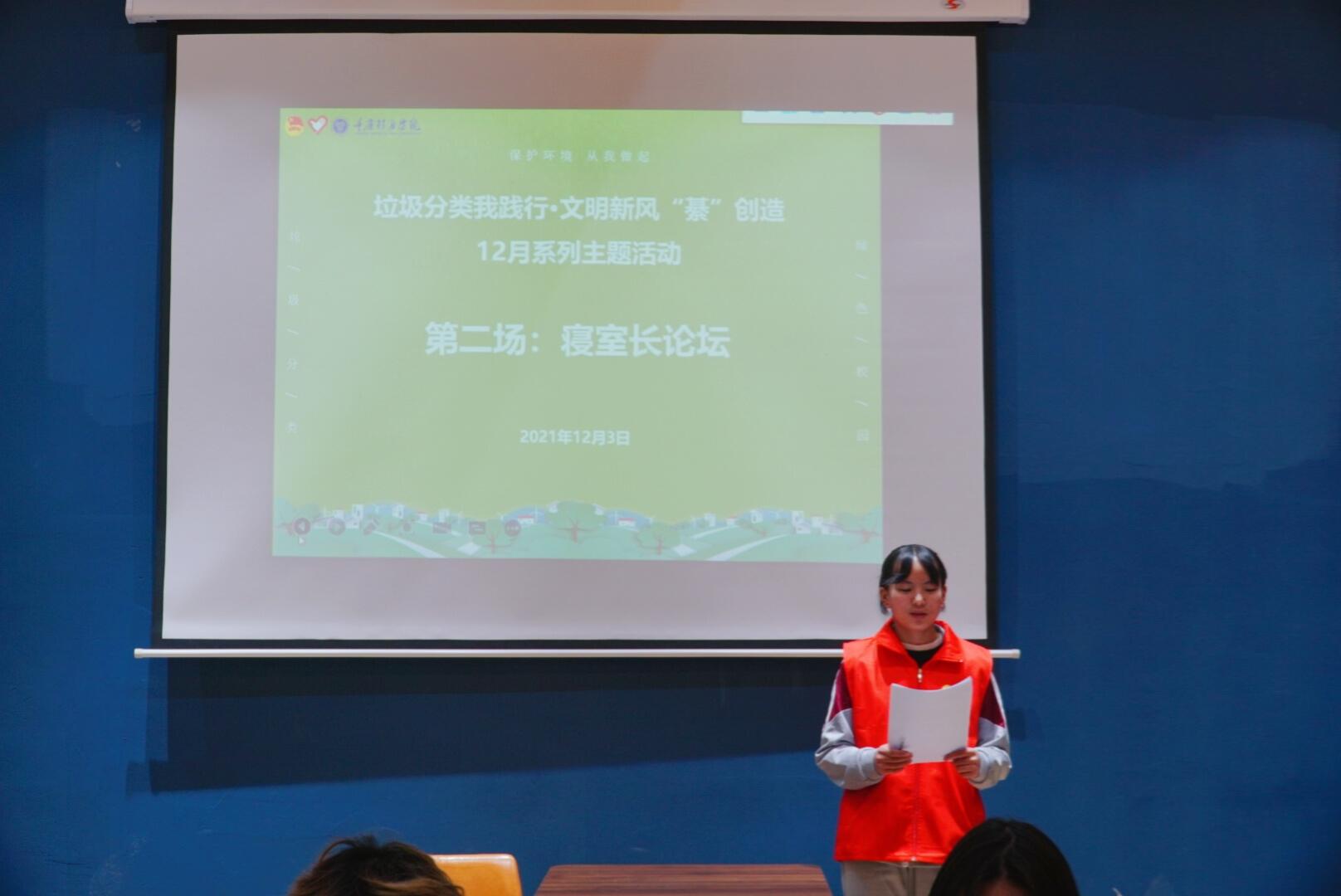 继第一弹|垃圾分类知识讲座之后,12月3日18:00在綦河书院多功能厅进行了系列活动第二弹:寝室长论坛。本次论坛围绕“垃圾分类政策解读、垃圾分类建言践行、垃圾分类活动策划”为主题进行开展,共计60名寝室长参加。